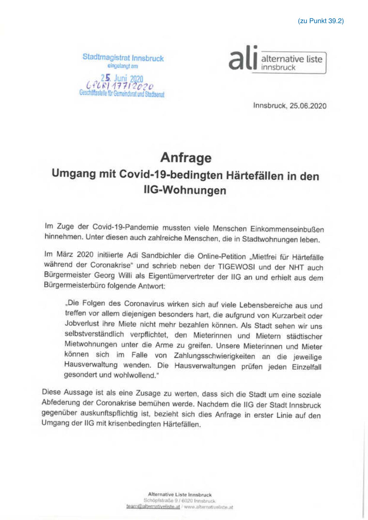 Abfederung der Coronakrise bemühen werde. Nachdem die HG der Stadt Innsbruck