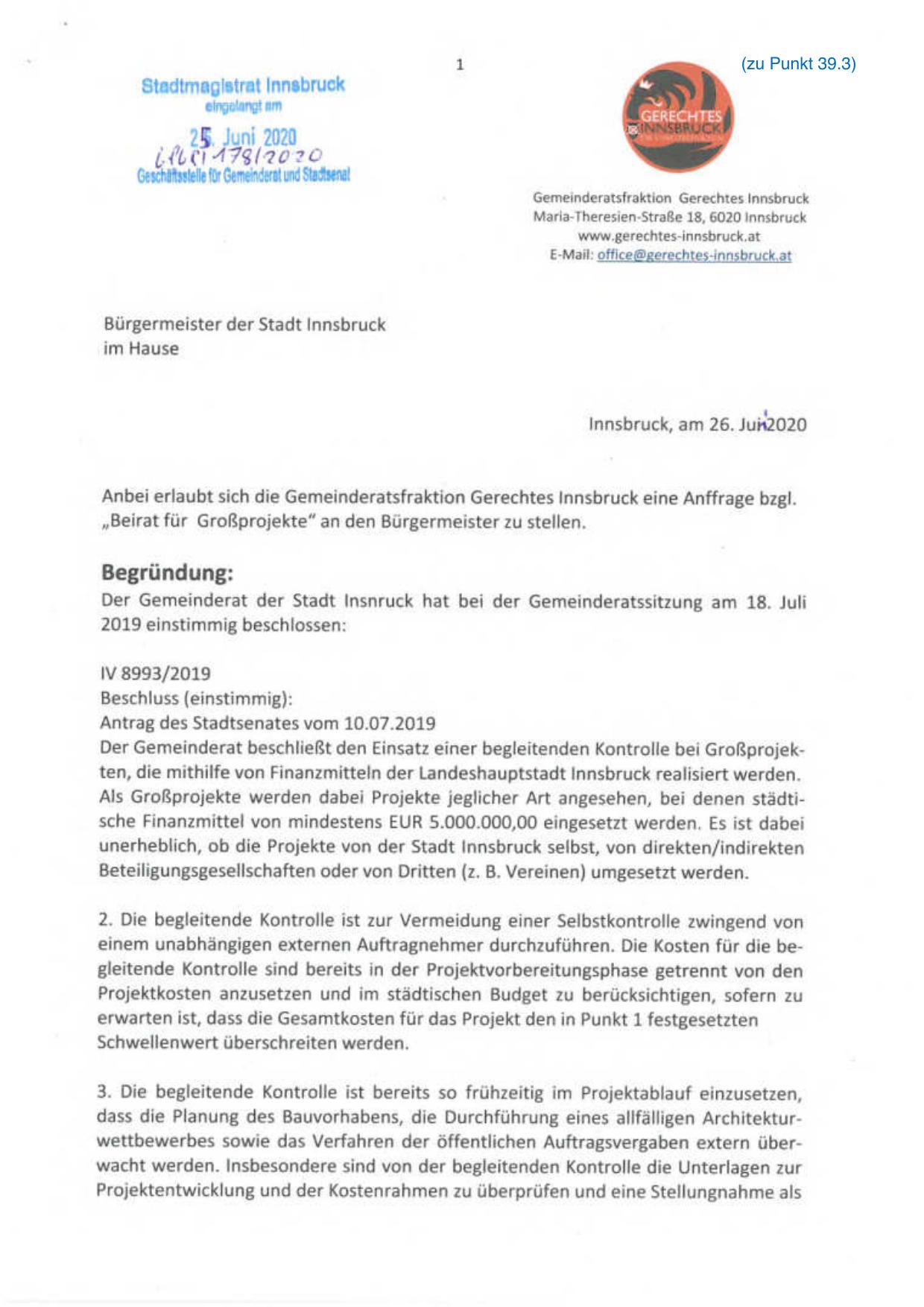 Der Gemeinderat beschließt den Einsatz einer begleitenden Kontrolle bei Großprojek ten, die mithilfe von Finanzmitteln der Landeshauptstadt Innsbruck realisiert werden.