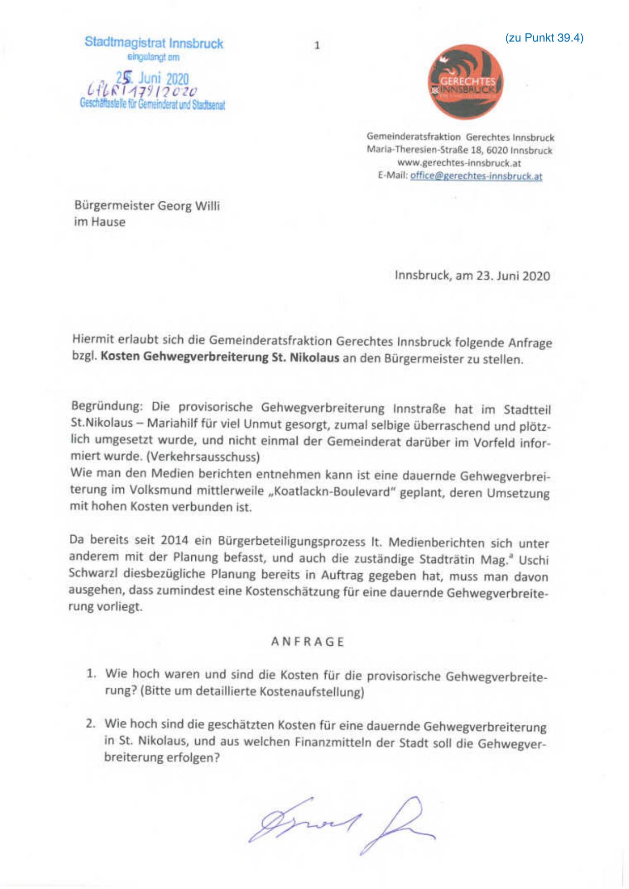 Hiermit erlaubt sich die Gemeinderatsfraktion Gerechtes Innsbruck folgende Anfrage