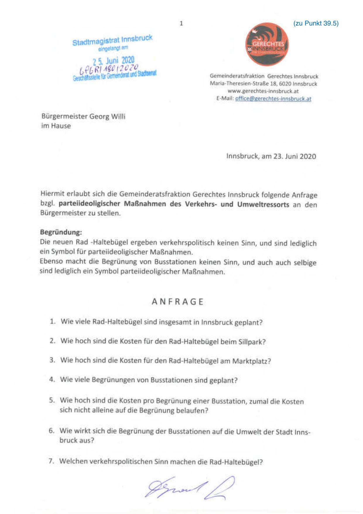 Hiermit erlaubt sich die Gemeinderatsfraktion Gerechtes Innsbruck folgende Anfrage