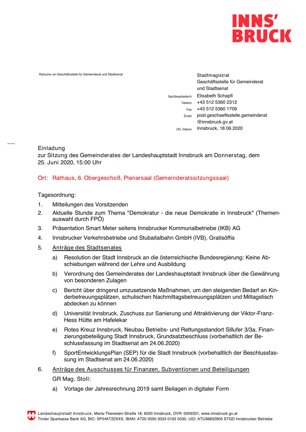 zur Sitzung des Gemeinderates der Landeshauptstadt Innsbruck am Donnerstag, dem