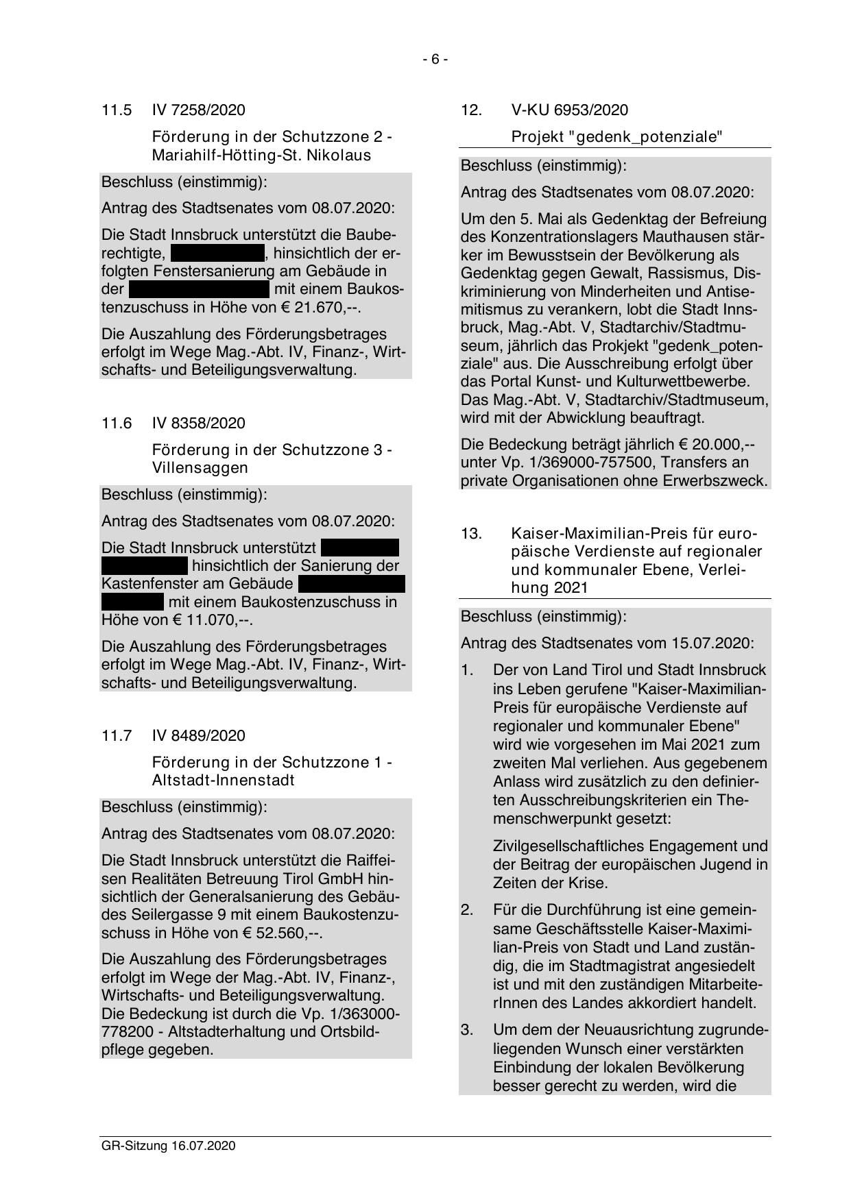 Die Stadt Innsbruck unterstützt die Raiffeisen Realitäten Betreuung Tirol GmbH hinsichtlich der Generalsanierung des Gebäudes Seilergasse 9 mit einem Baukostenzuschuss in Höhe von € 52.560,--.