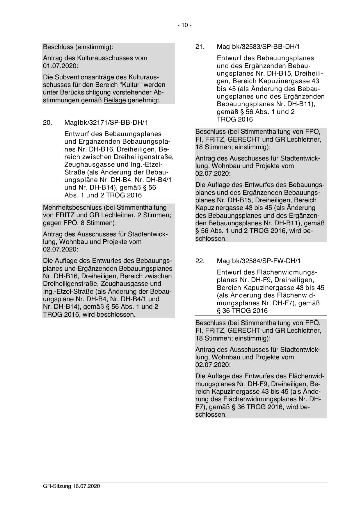 Die Auflage des Entwurfes des Flächenwidmungsplanes Nr. DH-F9, Dreiheiligen, Bereich Kapuzinergasse 43 bis 45 (als Änderung des Flächenwidmungsplanes Nr. DHF7), gemäß § 36 TROG 2016, wird beschlossen.