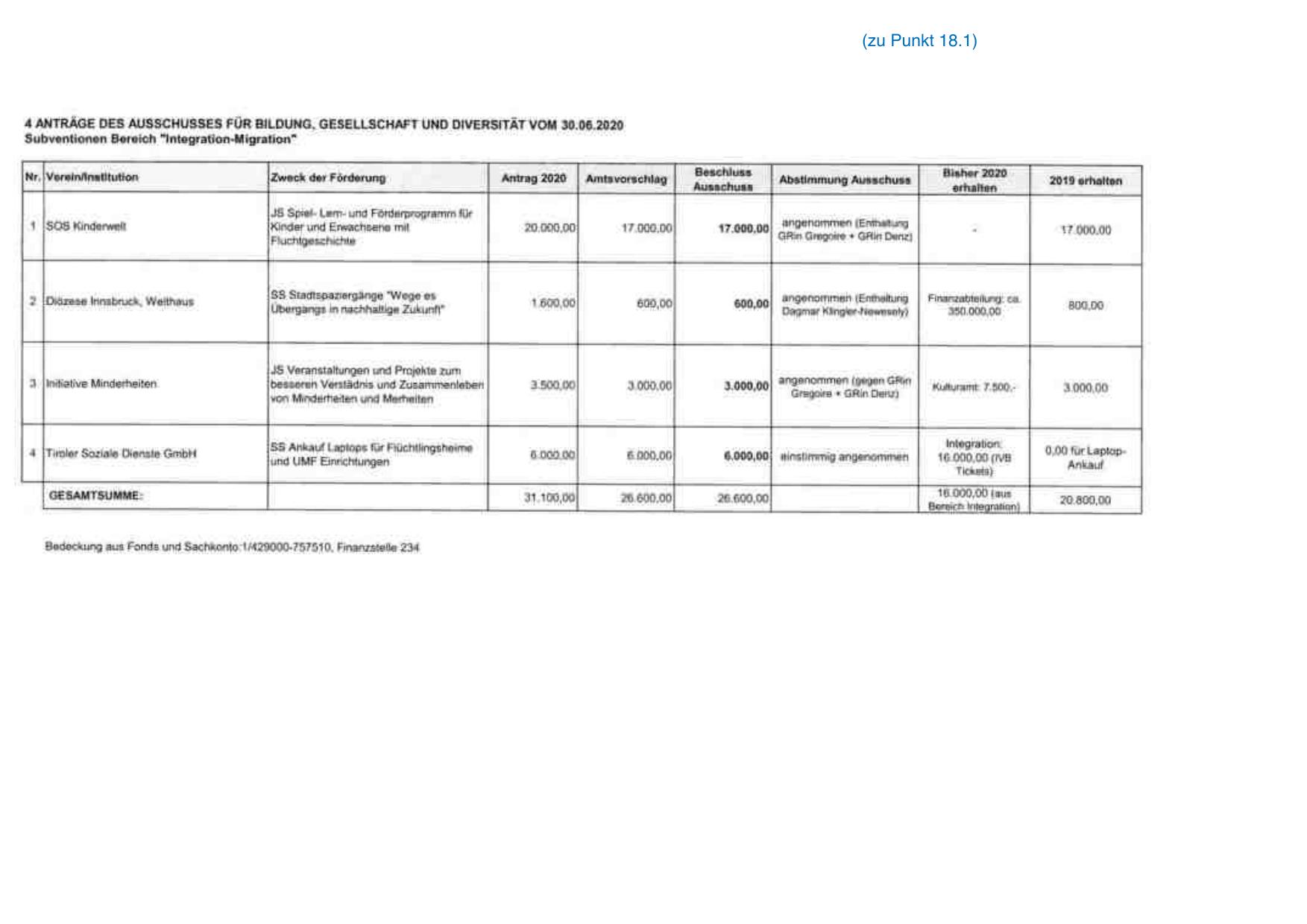 Bedeckung aus Fonds und Sachkonto:1/429000-757510, Finanzstelle 234