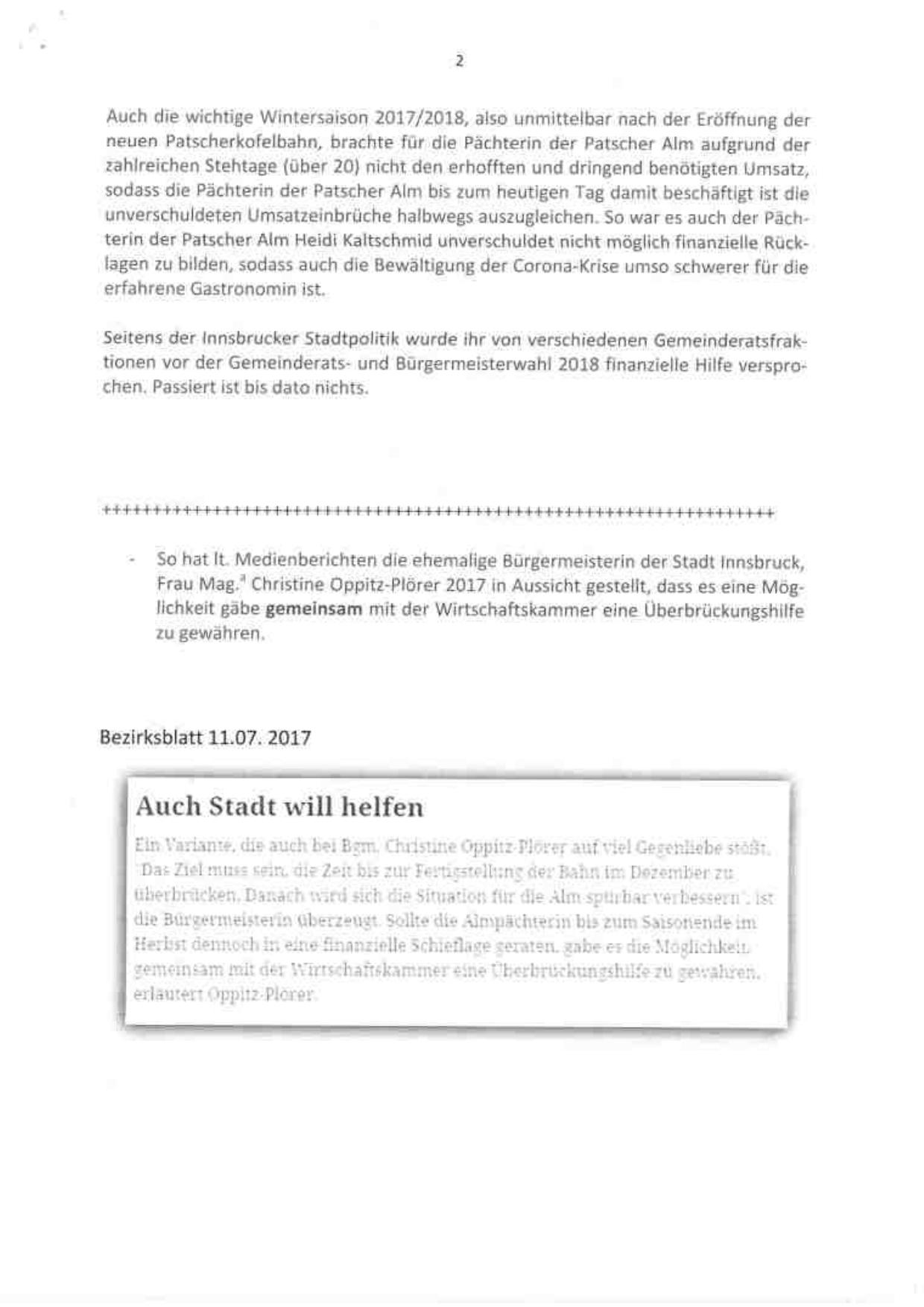 Seitens der Innsbrucker Stadtpolitik wurde ihr von verschiedenen Gemeinderatsfraktionen vor der Gemeinderats - und B ü rgermeisterwahl 2018 finanzielle Hilfe verspro chen. Passiert ist bis dato nichts.