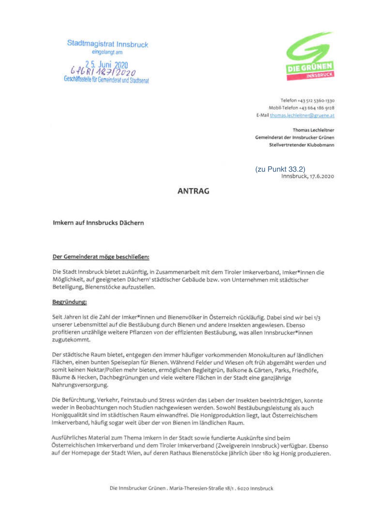 Die Stadt Innsbruck bietet zuk ünftig, in Zusammenarbeit mit dem Tiroler Imkerverband, lmker *innen die