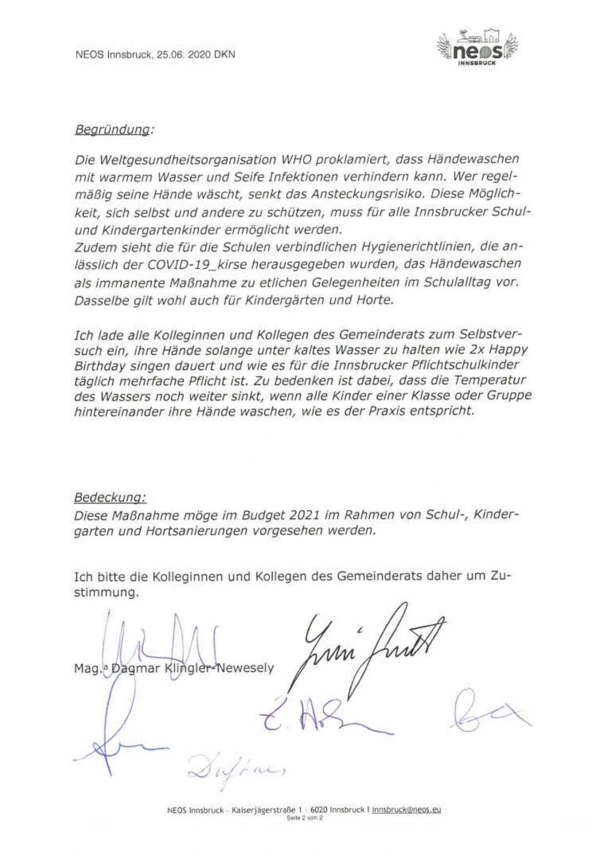 mit warmem Wasser und Seife Infektionen verhindern kann . Wer regel mäßig seine Hä nde w äscht, senkt das Ansteckungsrisiko . Diese Möglich keit, sich selbst und andere zu schü tzen, muss für alle Innsbrucker Schul und Kindergartenkinder ermöglicht werden.