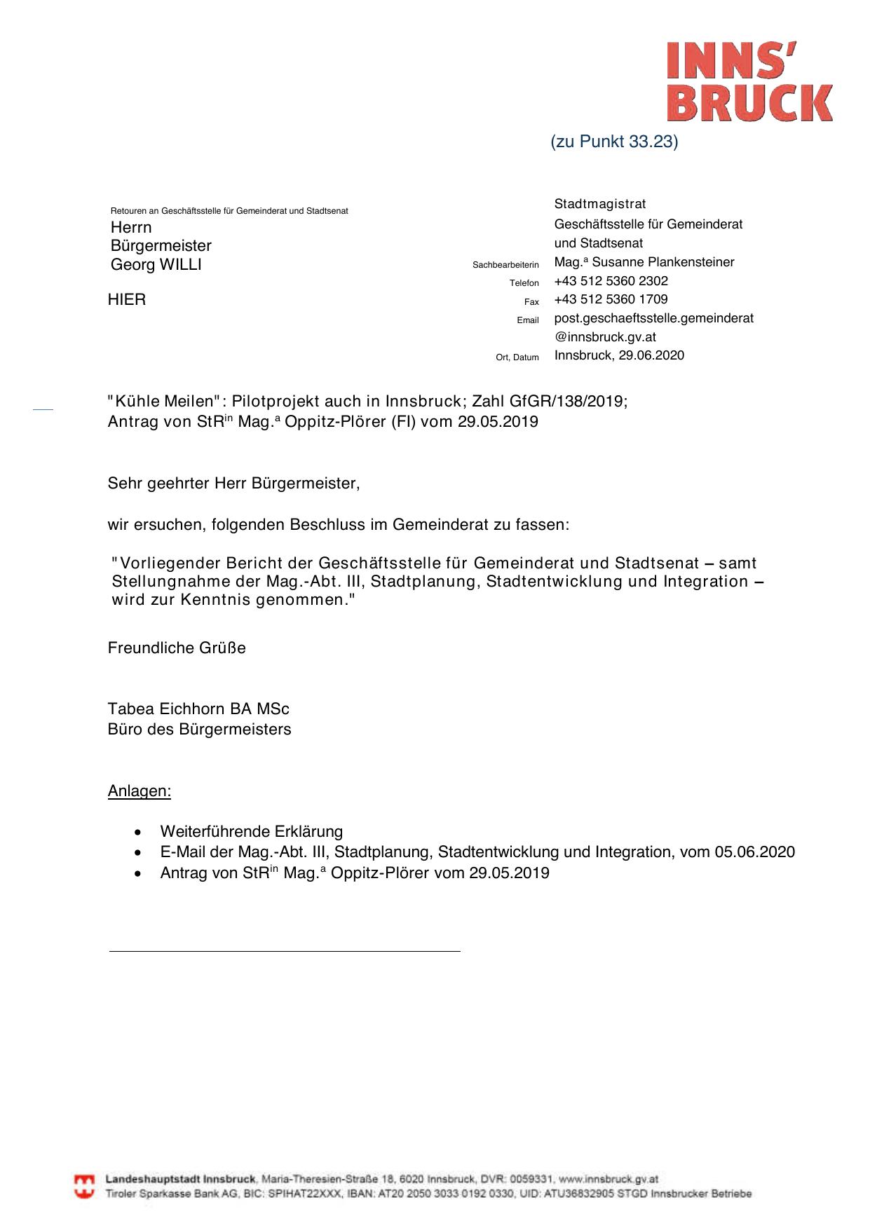"Kühle Meilen": Pilotprojekt auch in Innsbruck; Zahl GfGR/138/2019;