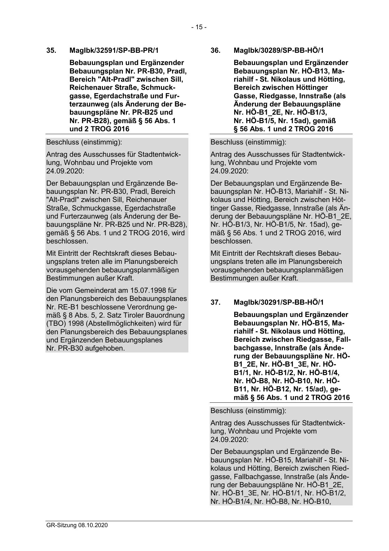 Der Bebauungsplan und Ergänzende Bebauungsplan Nr. HÖ-B15, Mariahilf - St. Nikolaus und Hötting, Bereich zwischen Riedgasse, Fallbachgasse, Innstraße (als Änderung der Bebauungspläne Nr. HÖ-B1_2E,