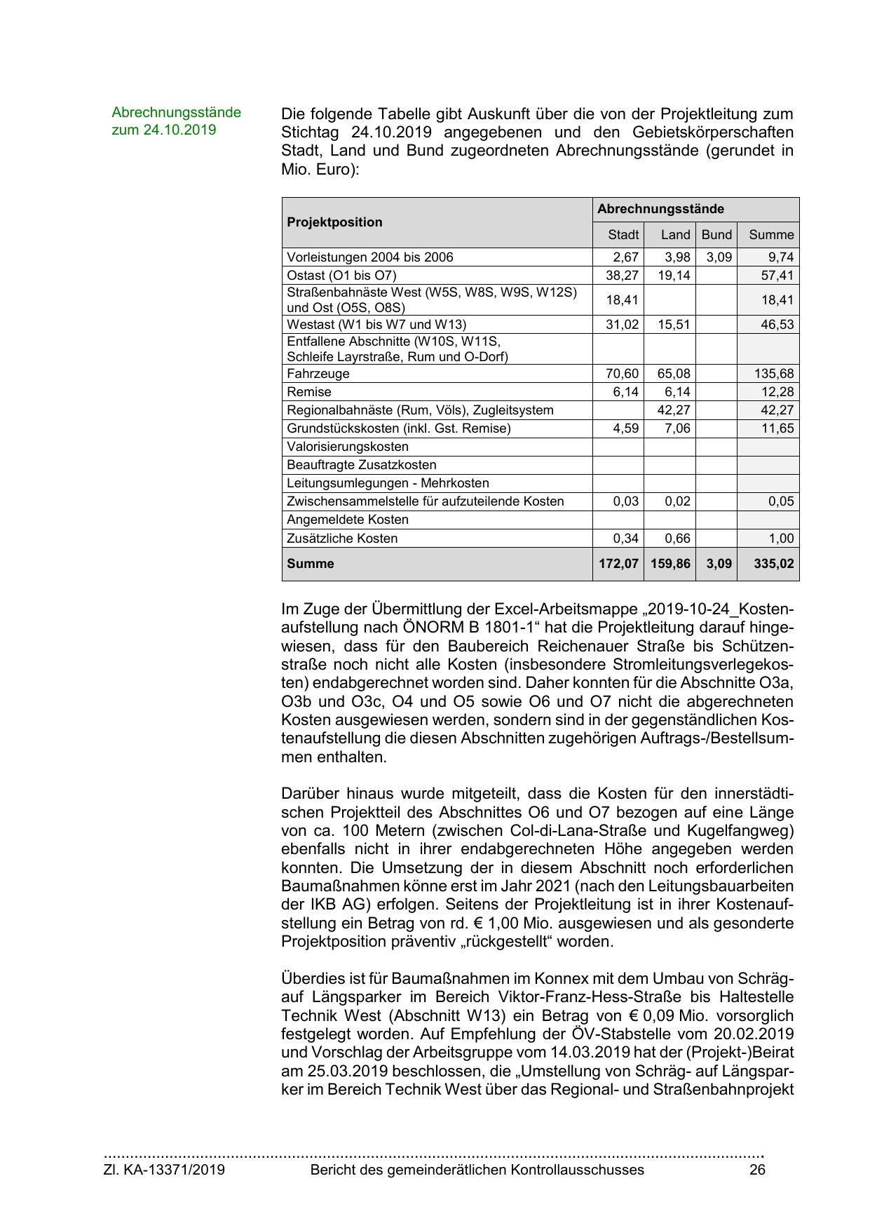 Im Zuge der Übermittlung der Excel-Arbeitsmappe „2019-10-24_Kostenaufstellung nach ÖNORM B 1801-1“ hat die Projektleitung darauf hingewiesen, dass für den Baubereich Reichenauer Straße bis Schützenstraße noch nicht alle Kosten (insbesondere Stromleitungsverlegekosten) endabgerechnet worden sind. Daher konnten für die Abschnitte O3a,