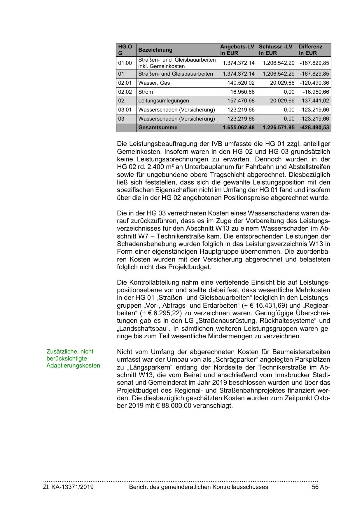 in der HG 01 „Straßen- und Gleisbauarbeiten“ lediglich in den Leistungsgruppen „Vor-, Abtrags- und Erdarbeiten“ (+ € 16.431,69) und „Regiearbeiten“ (+ € 6.295,22) zu verzeichnen waren. Geringfügige Überschreitungen gab es in den LG „Straßenausrüstung, Rückhaltesysteme“ und
