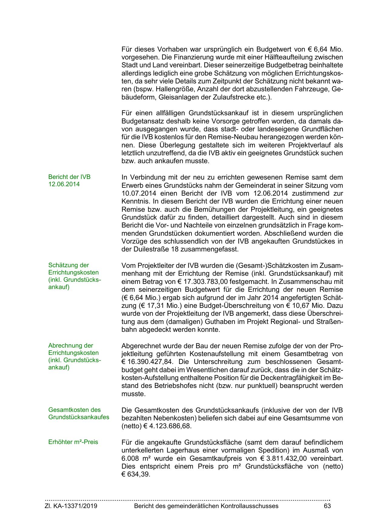 (€ 6,64 Mio.) ergab sich aufgrund der im Jahr 2014 angefertigten Schätzung (€ 17,31 Mio.) eine Budget-Überschreitung von € 10,67 Mio. Dazu