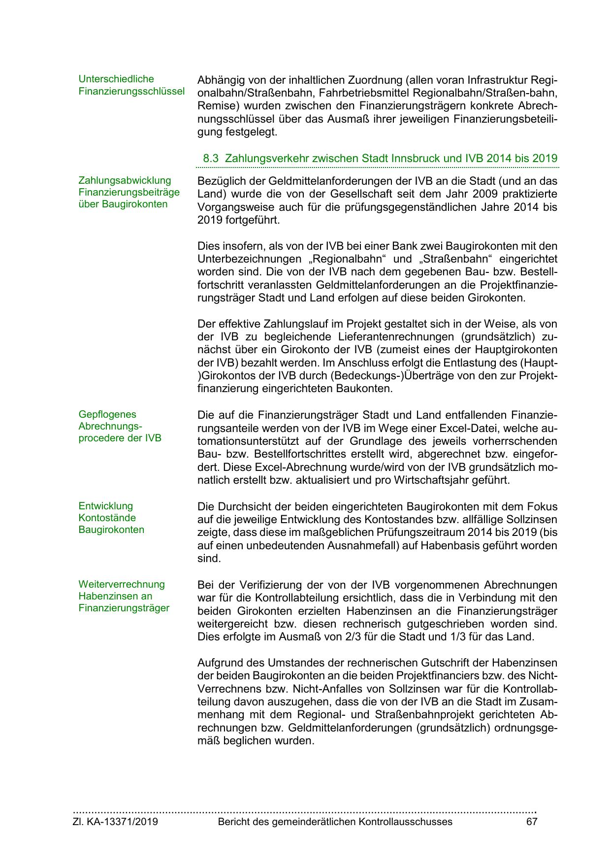 der beiden Baugirokonten an die beiden Projektfinanciers bzw. des NichtVerrechnens bzw. Nicht-Anfalles von Sollzinsen war für die Kontrollabteilung davon auszugehen, dass die von der IVB an die Stadt im Zusammenhang mit dem Regional- und Straßenbahnprojekt gerichteten Abrechnungen bzw. Geldmittelanforderungen (grundsätzlich) ordnungsgemäß beglichen wurden.