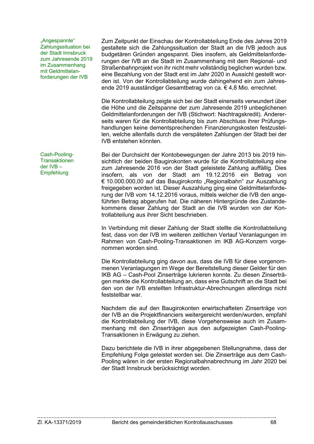 Geldmittelanforderungen der IVB (Stichwort: Nachtragskredit). Andererseits waren für die Kontrollabteilung bis zum Abschluss ihrer Prüfungshandlungen keine dementsprechenden Finanzierungskosten festzustellen, welche allenfalls durch die verspäteten Zahlungen der Stadt bei der