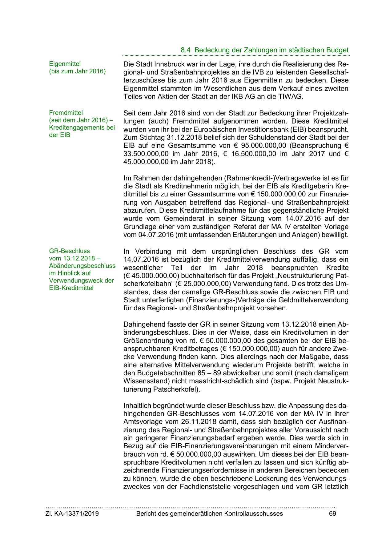 (€ 45.000.000,00) buchhalterisch für das Projekt „Neustrukturierung Patscherkofelbahn“ (€ 25.000.000,00) Verwendung fand. Dies trotz des Umstandes, dass der damalige GR-Beschluss sowie die zwischen EIB und