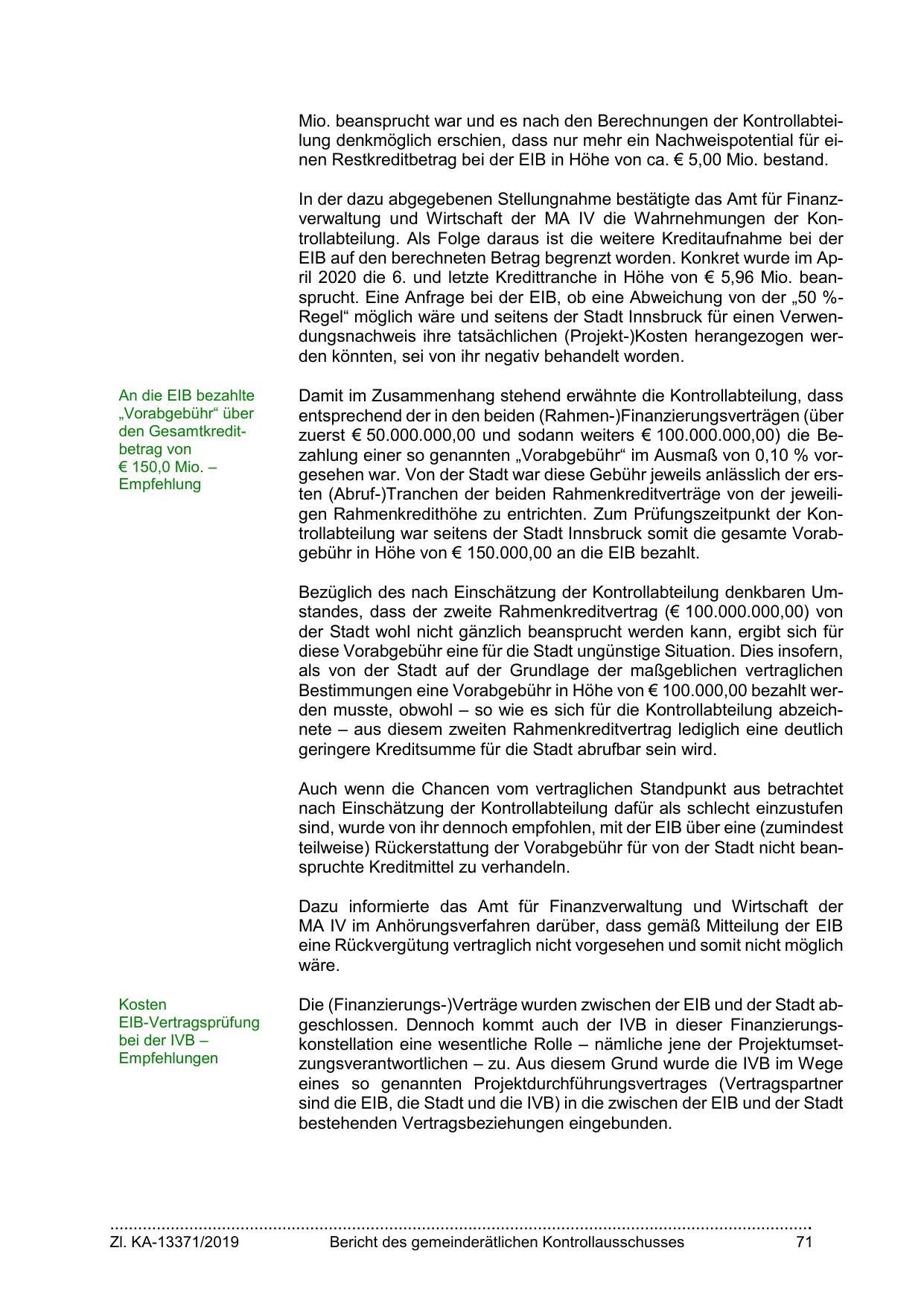 EIB auf den berechneten Betrag begrenzt worden. Konkret wurde im April 2020 die 6. und letzte Kredittranche in Höhe von € 5,96 Mio. beansprucht. Eine Anfrage bei der EIB, ob eine Abweichung von der „50 %Regel“ möglich wäre und seitens der Stadt Innsbruck für einen Verwendungsnachweis ihre tatsächlichen (Projekt-)Kosten herangezogen werden könnten, sei von ihr negativ behandelt worden.