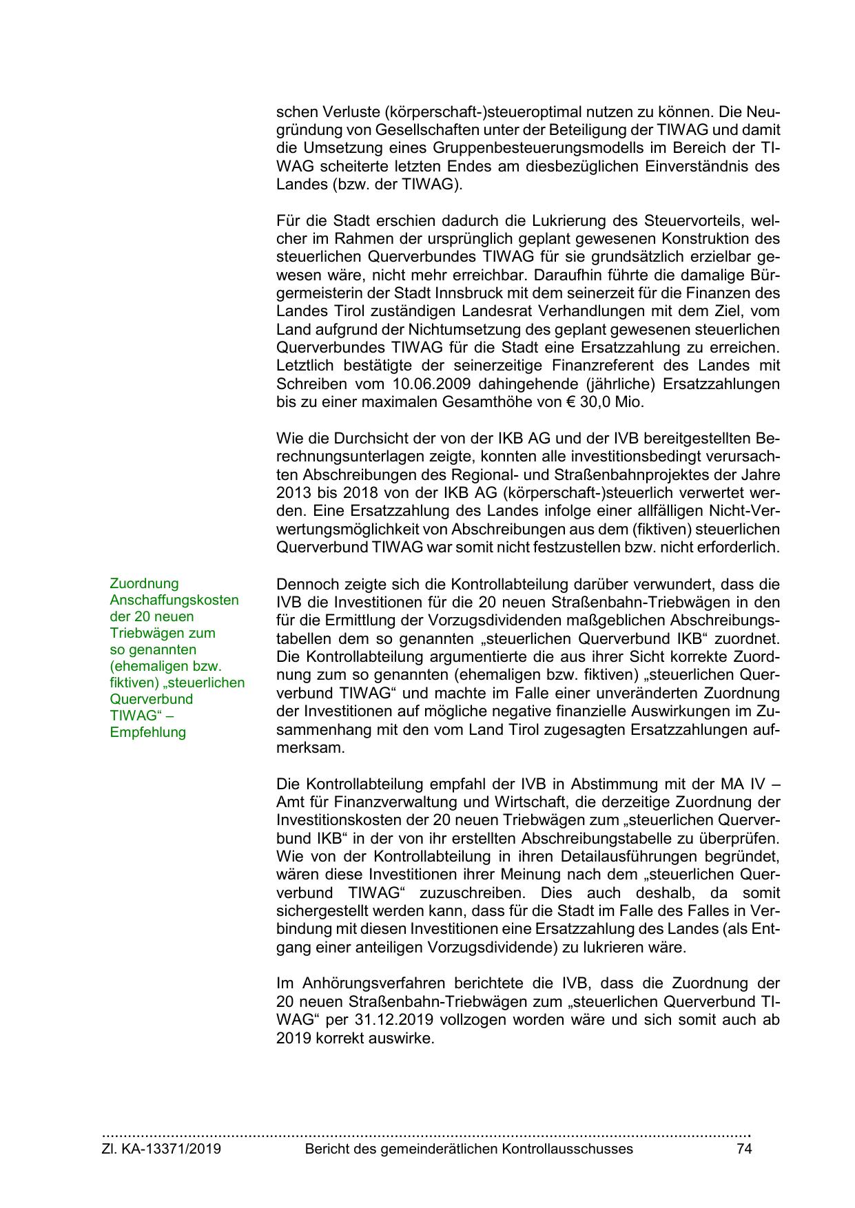 20 neuen Straßenbahn-Triebwägen zum „steuerlichen Querverbund TIWAG“ per 31.12.2019 vollzogen worden wäre und sich somit auch ab