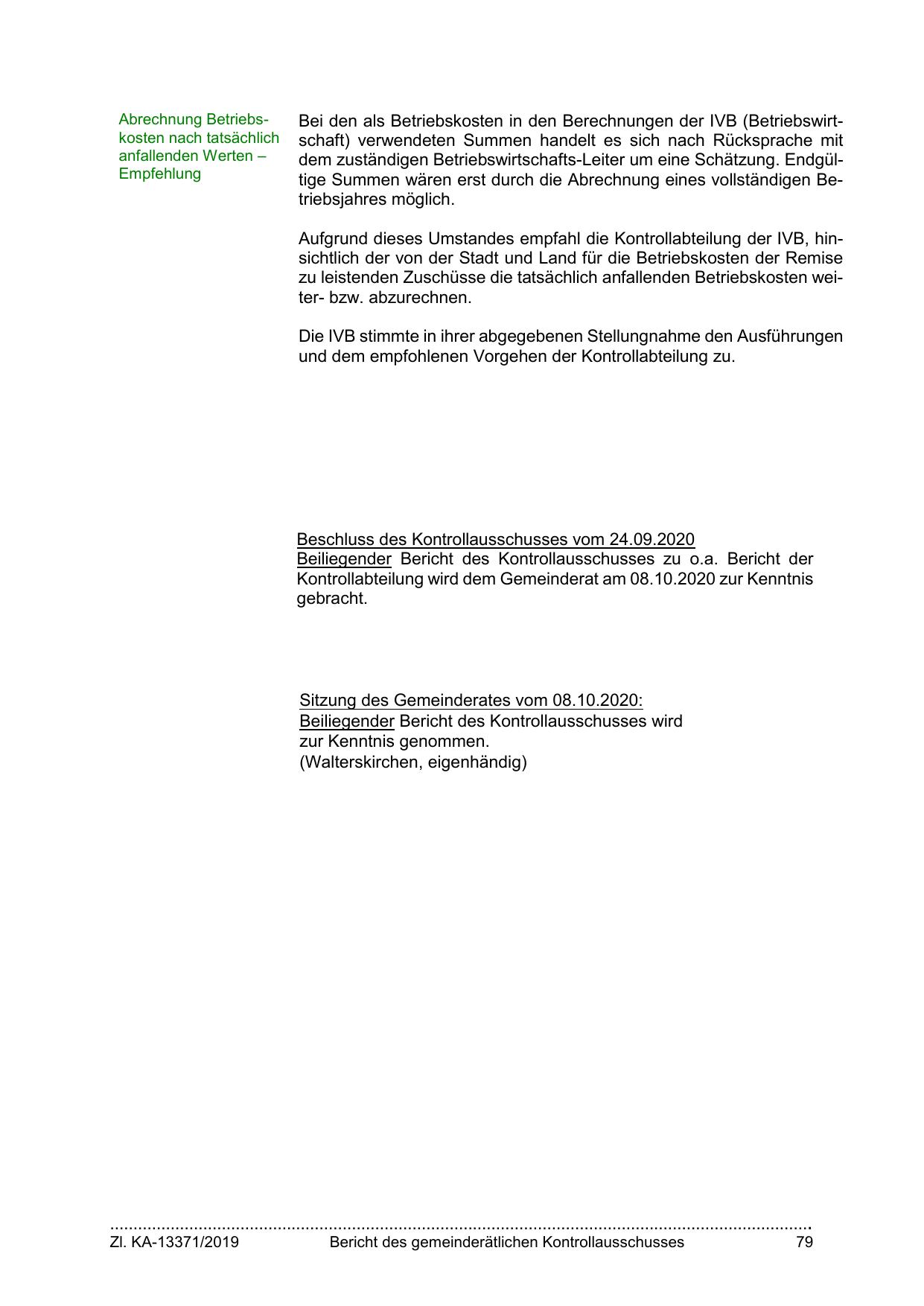 Aufgrund dieses Umstandes empfahl die Kontrollabteilung der IVB, hinsichtlich der von der Stadt und Land für die Betriebskosten der Remise