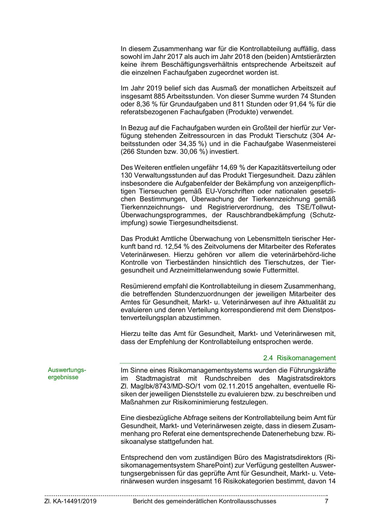 Gesundheit, Markt- und Veterinärwesen zeigte, dass in diesem Zusammenhang pro Referat eine dementsprechende Datenerhebung bzw. Risikoanalyse stattgefunden hat.