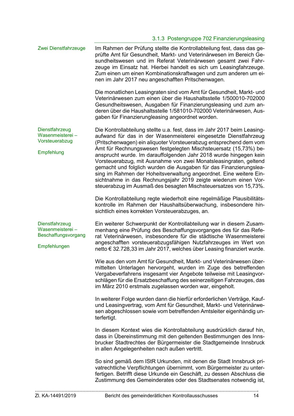 gemacht und folglich wurden die Ausgaben für das Finanzierungsleasing im Rahmen der Hoheitsverwaltung angeordnet. Eine weitere Einsichtnahme in das Rechnungsjahr 2019 zeigte wiederum einen Vorsteuerabzug im Ausmaß des besagten Mischsteuersatzes von 15,73%.