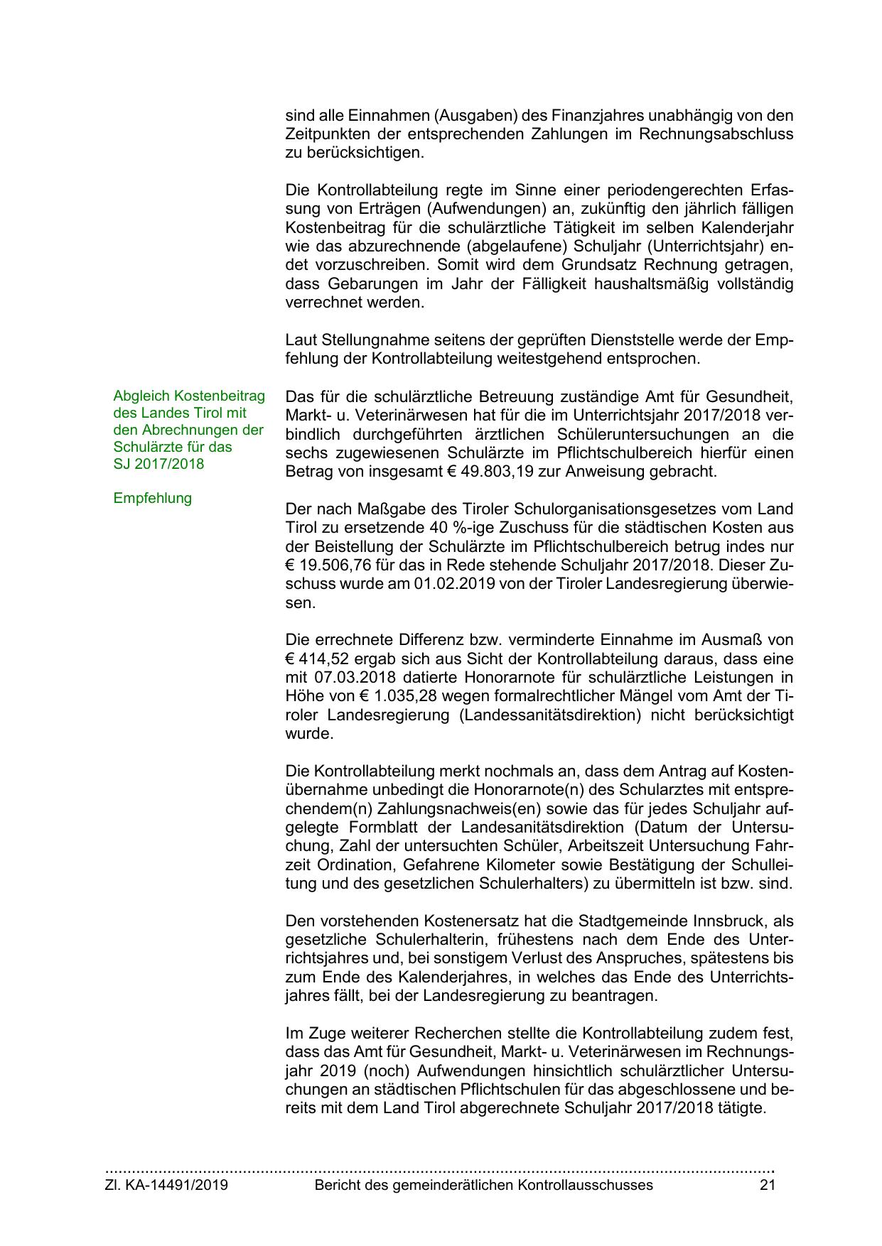 dass das Amt für Gesundheit, Markt- u. Veterinärwesen im Rechnungsjahr 2019 (noch) Aufwendungen hinsichtlich schulärztlicher Untersuchungen an städtischen Pflichtschulen für das abgeschlossene und bereits mit dem Land Tirol abgerechnete Schuljahr 2017/2018 tätigte.