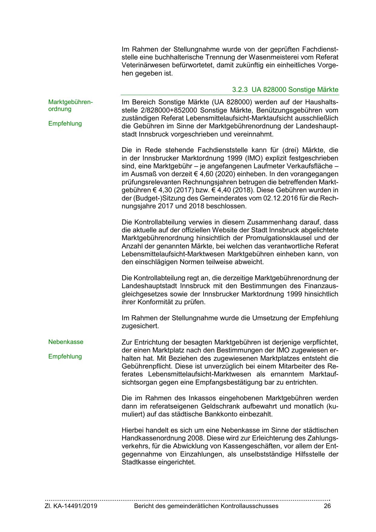 Die Kontrollabteilung regt an, die derzeitige Marktgebührenordnung der