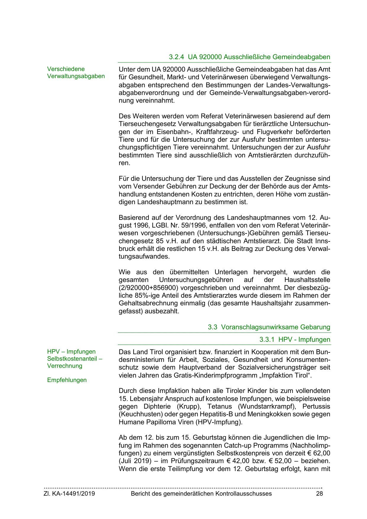Basierend auf der Verordnung des Landeshauptmannes vom 12. August 1996, LGBl. Nr. 59/1996, entfallen von den vom Referat Veterinärwesen vorgeschriebenen (Untersuchungs-)Gebühren gemäß Tierseuchengesetz 85 v.H. auf den städtischen Amtstierarzt. Die Stadt Innsbruck erhält die restlichen 15 v.H. als Beitrag zur Deckung des Verwaltungsaufwandes.