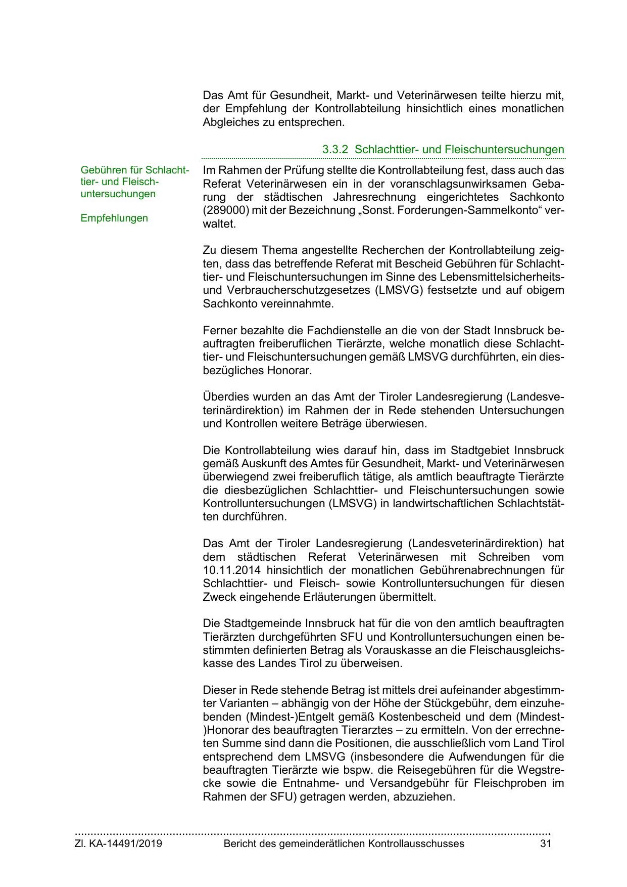 Ferner bezahlte die Fachdienstelle an die von der Stadt Innsbruck beauftragten freiberuflichen Tierärzte, welche monatlich diese Schlachttier- und Fleischuntersuchungen gemäß LMSVG durchführten, ein diesbezügliches Honorar.