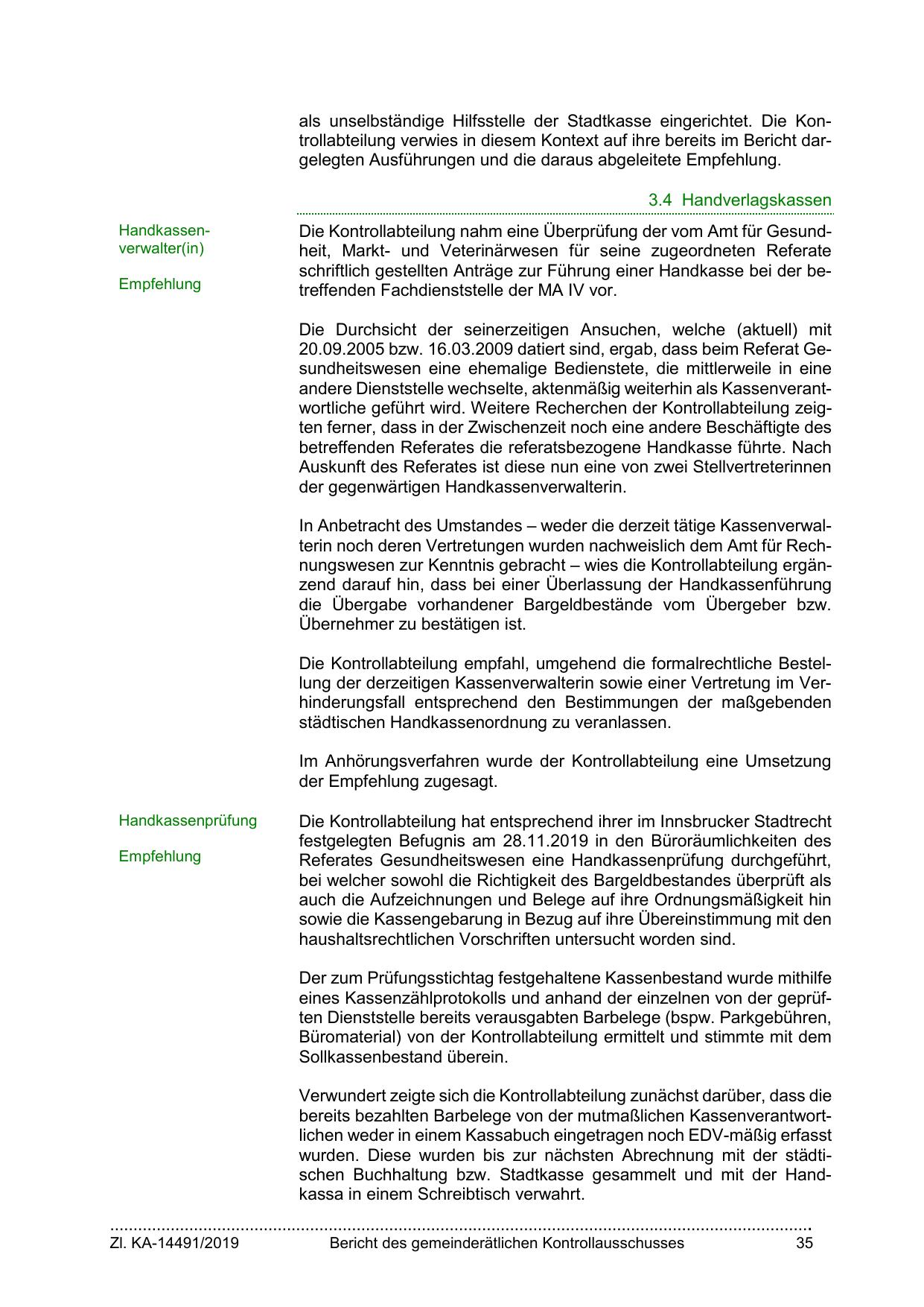 In Anbetracht des Umstandes – weder die derzeit tätige Kassenverwalterin noch deren Vertretungen wurden nachweislich dem Amt für Rechnungswesen zur Kenntnis gebracht – wies die Kontrollabteilung ergänzend darauf hin, dass bei einer Überlassung der Handkassenführung
