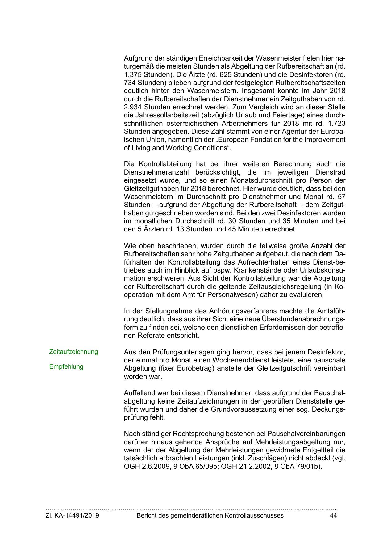 Rufbereitschaften sehr hohe Zeitguthaben aufgebaut, die nach dem Dafürhalten der Kontrollabteilung das Aufrechterhalten eines Dienst-betriebes auch im Hinblick auf bspw. Krankenstände oder Urlaubskonsumation erschweren. Aus Sicht der Kontrollabteilung war die Abgeltung