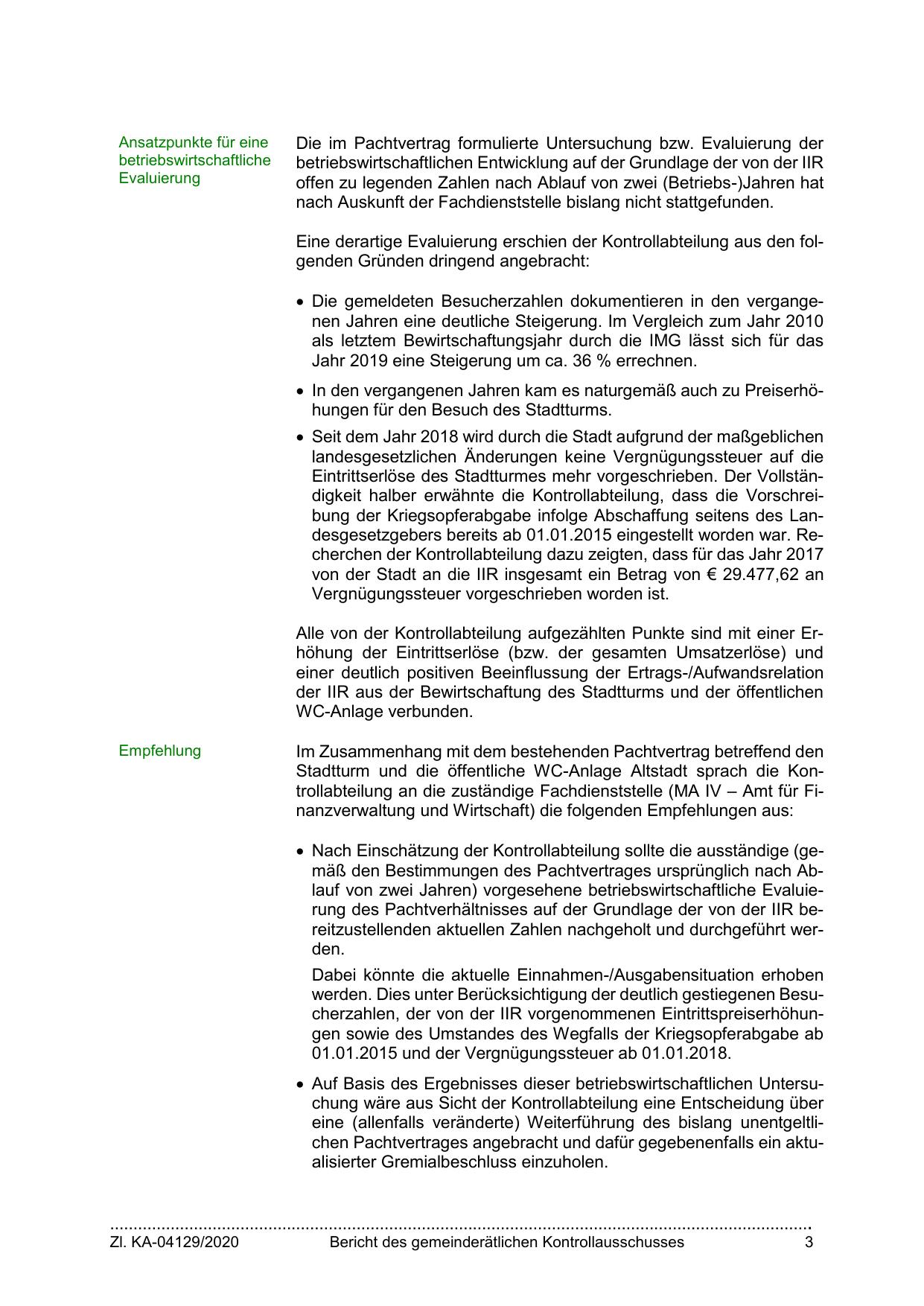 Stadtturm und die öffentliche WC-Anlage Altstadt sprach die Kontrollabteilung an die zuständige Fachdienststelle (MA IV – Amt für Finanzverwaltung und Wirtschaft) die folgenden Empfehlungen aus: