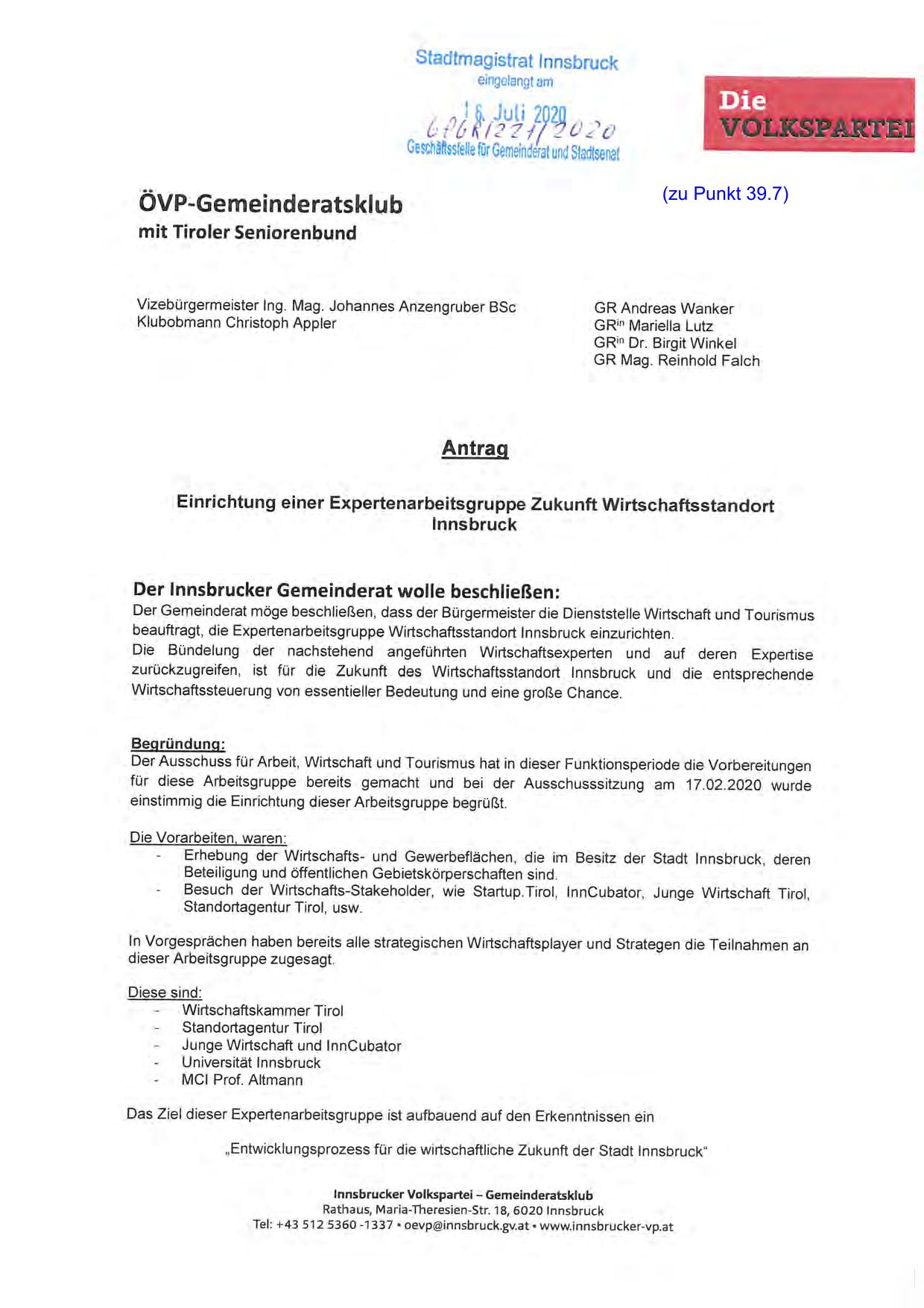 beauftragt, die Expertenarbeitsgruppe Wirtschaftsstandort Innsbruck einzurichten.