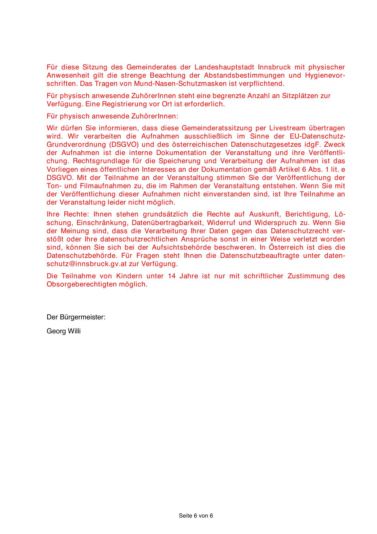 Für diese Sitzung des Gemeinderates der Landeshauptstadt Innsbruck mit physischer