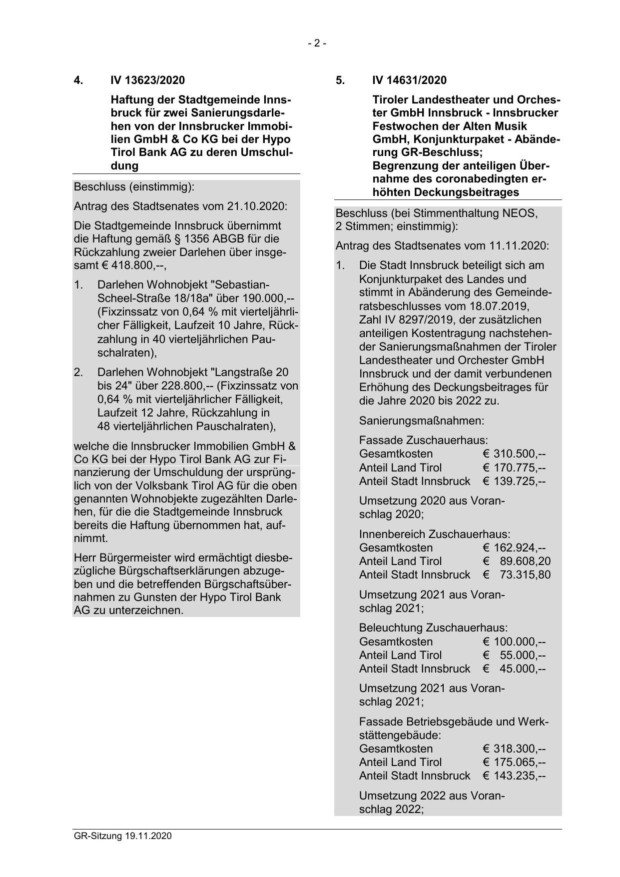 € 170.775,-Anteil Stadt Innsbruck € 139.725,-Umsetzung 2020 aus Voranschlag 2020;