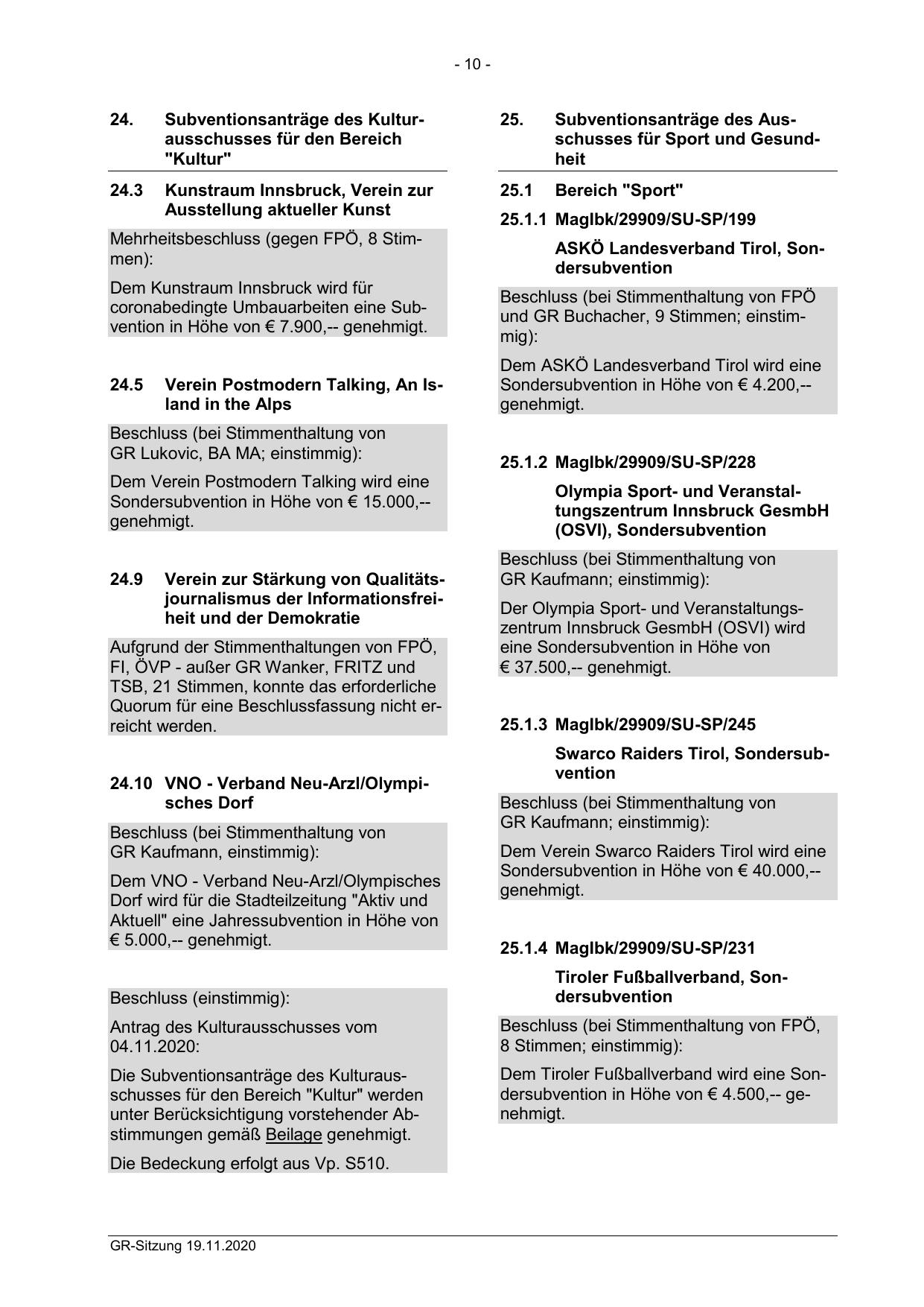 Mehrheitsbeschluss (gegen FPÖ, 8 Stimmen):