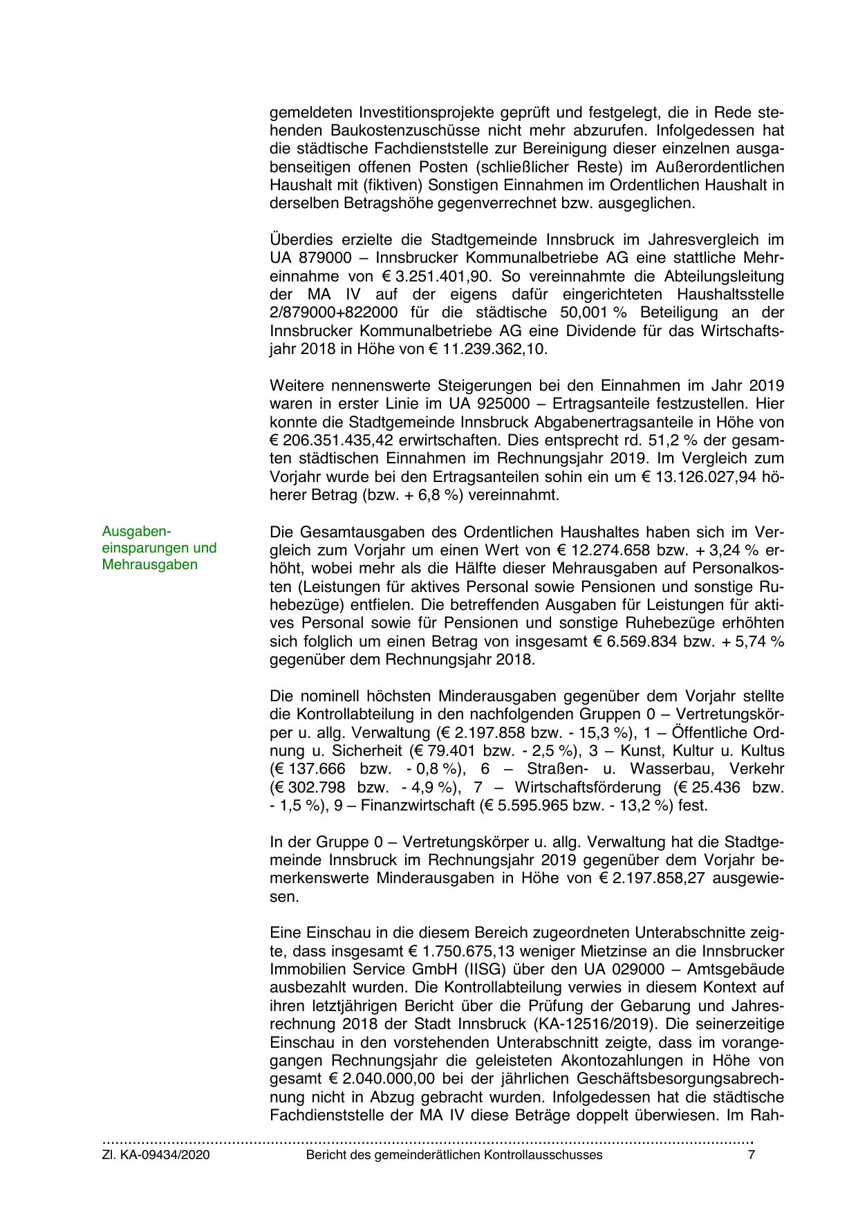 In der Gruppe 0 – Vertretungskörper u. allg. Verwaltung hat die Stadtgemeinde Innsbruck im Rechnungsjahr 2019 gegenüber dem Vorjahr bemerkenswerte Minderausgaben in Höhe von € 2.197.858,27 ausgewiesen.