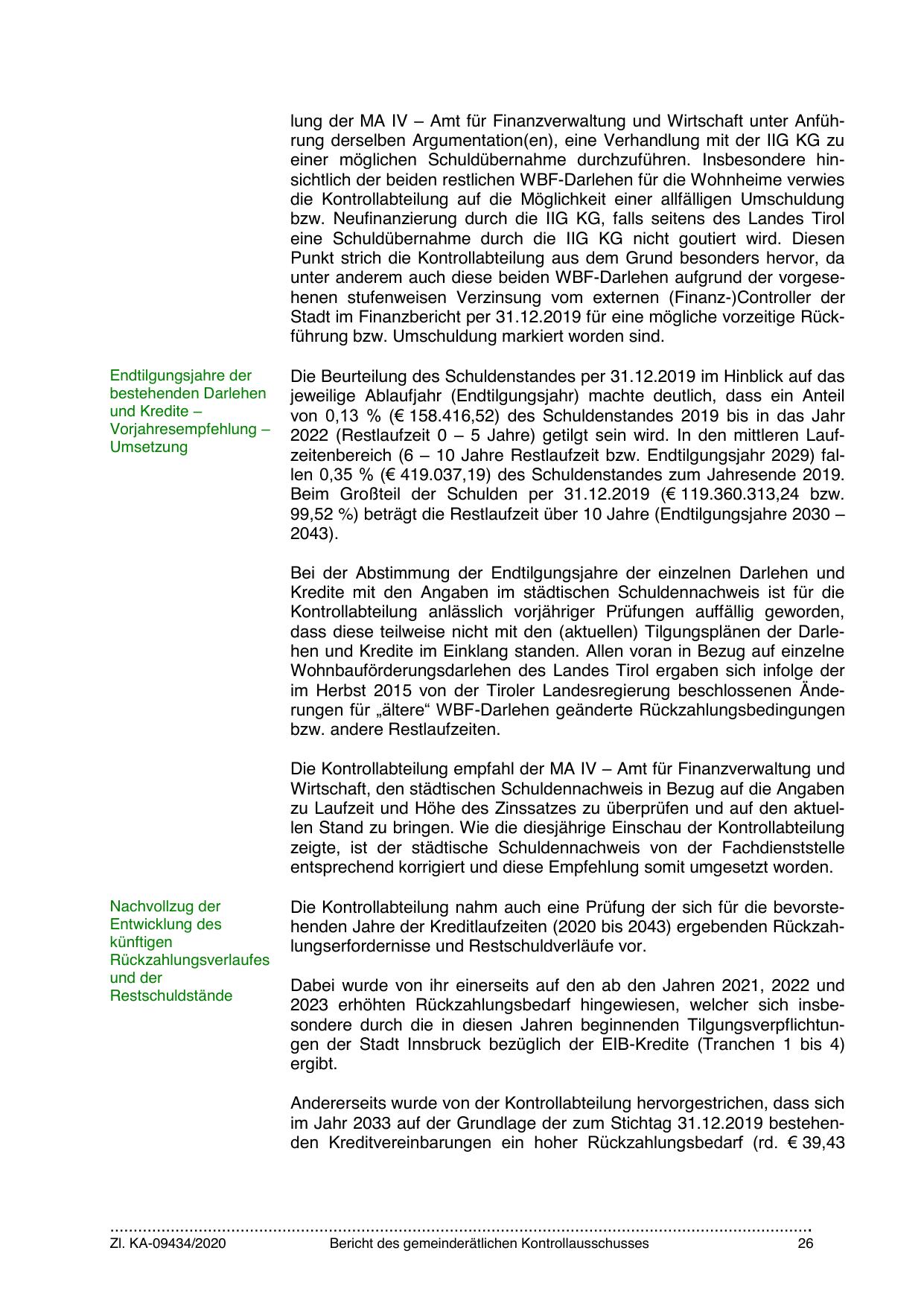 Stadt im Finanzbericht per 31.12.2019 für eine mögliche vorzeitige Rückführung bzw. Umschuldung markiert worden sind.