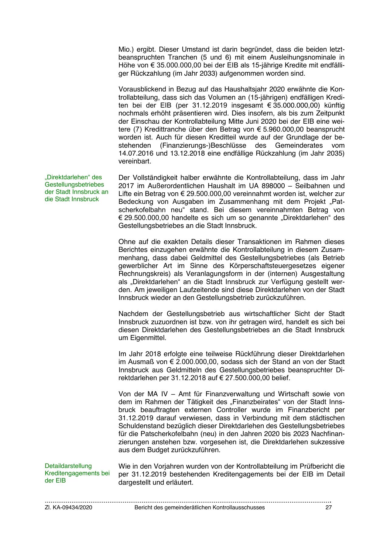 Innsbruck aus Geldmitteln des Gestellungsbetriebes beanspruchter Direktdarlehen per 31.12.2018 auf € 27.500.000,00 belief.