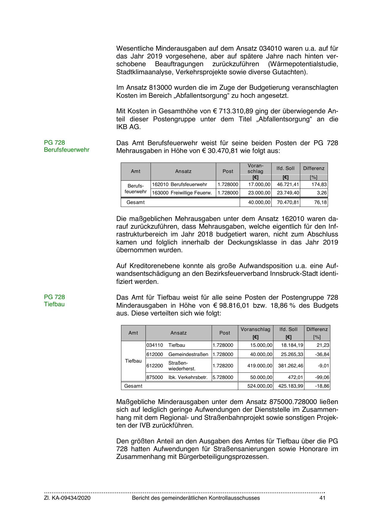 Auf Kreditorenebene konnte als große Aufwandsposition u.a. eine Aufwandsentschädigung an den Bezirksfeuerverband Innsbruck-Stadt identifiziert werden.
