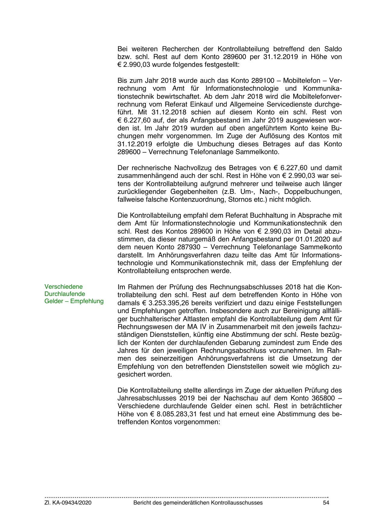 Bis zum Jahr 2018 wurde auch das Konto 289100 – Mobiltelefon – Verrechnung vom Amt für Informationstechnologie und Kommunikationstechnik bewirtschaftet. Ab dem Jahr 2018 wird die Mobiltelefonverrechnung vom Referat Einkauf und Allgemeine Servicedienste durchgeführt. Mit 31.12.2018 schien auf diesem Konto ein schl. Rest von