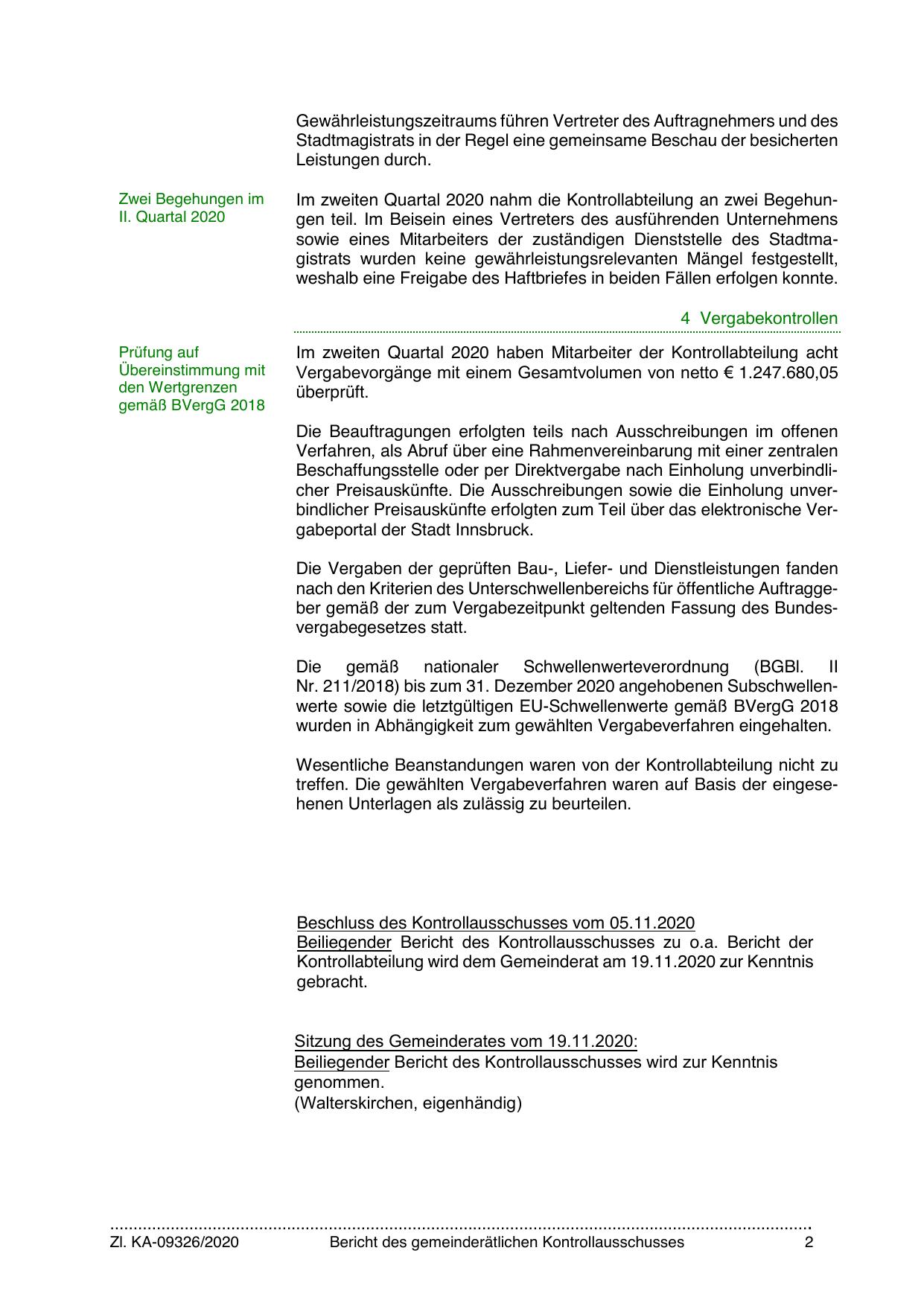 Beschluss des Kontrollausschusses vom 05.11.2020