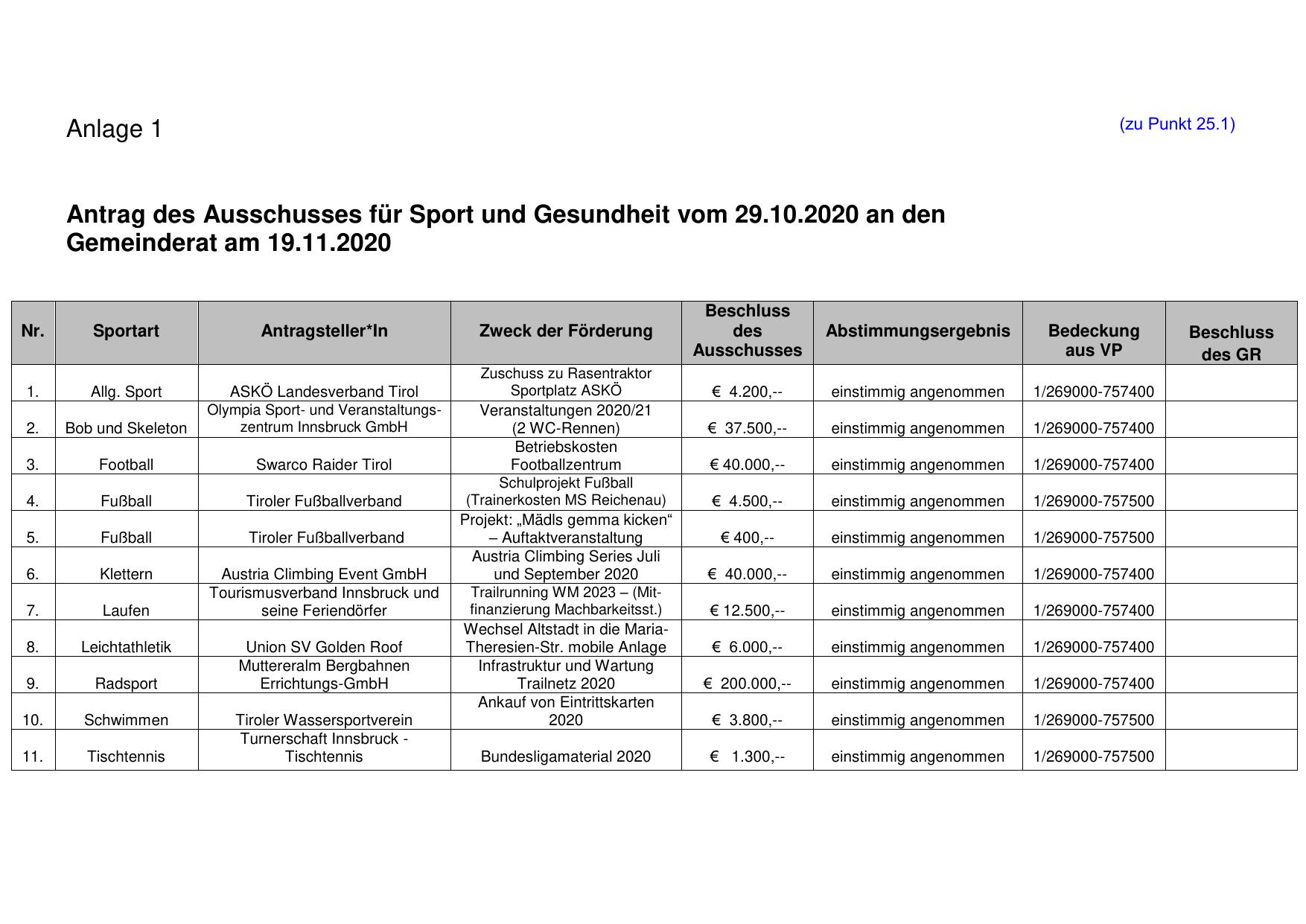 Antrag des Ausschusses für Sport und Gesundheit vom 29.10.2020 an den