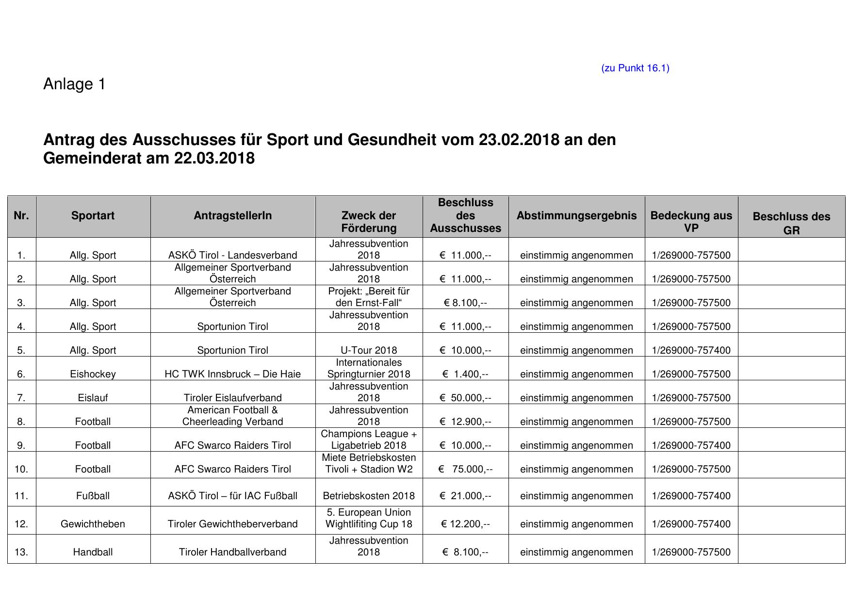 Antrag des Ausschusses für Sport und Gesundheit vom 23.02.2018 an den