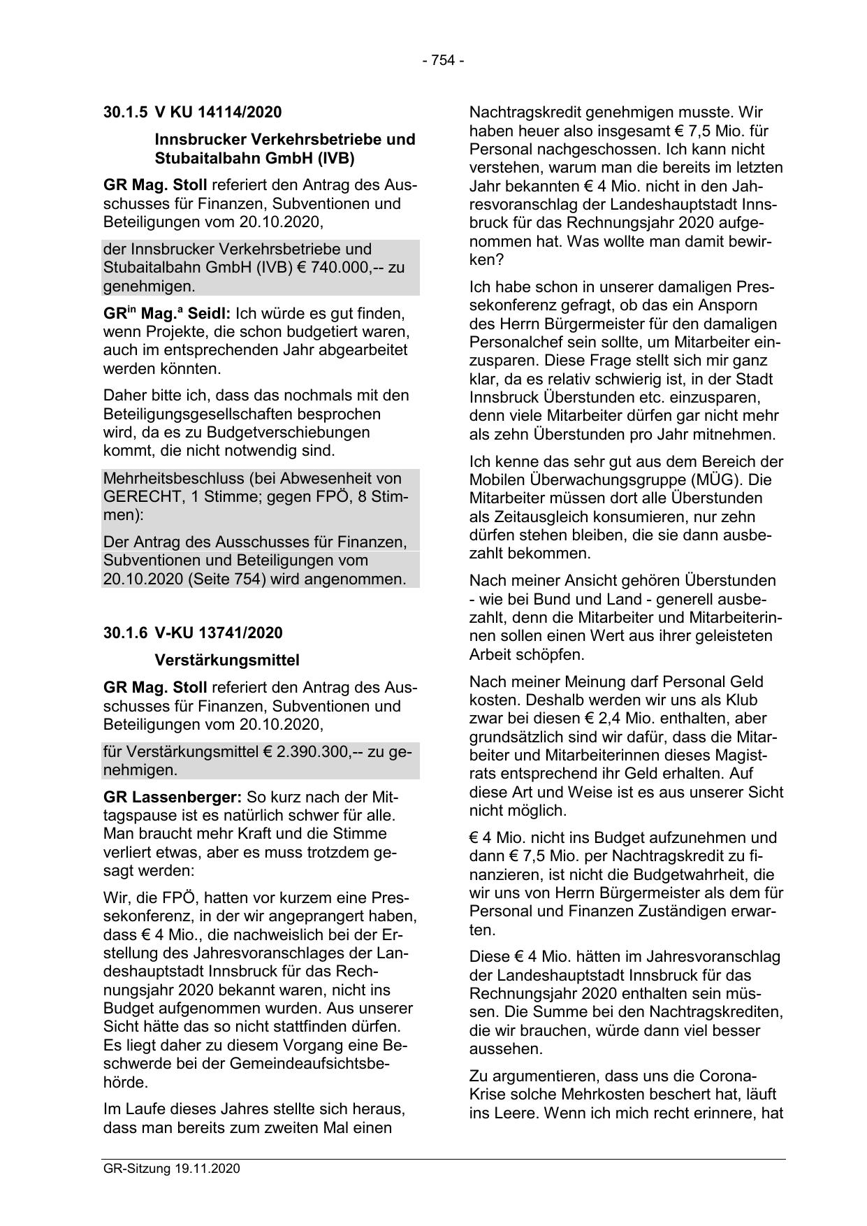 Jahr bekannten € 4 Mio. nicht in den Jahresvoranschlag der Landeshauptstadt Innsbruck für das Rechnungsjahr 2020 aufgenommen hat. Was wollte man damit bewirken?