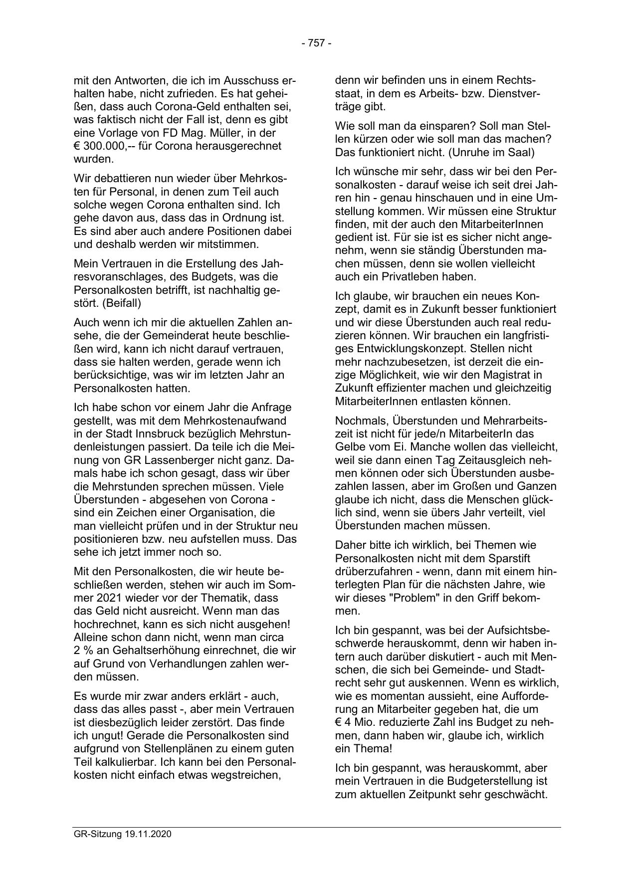 in der Stadt Innsbruck bezüglich Mehrstundenleistungen passiert. Da teile ich die Meinung von GR Lassenberger nicht ganz. Damals habe ich schon gesagt, dass wir über