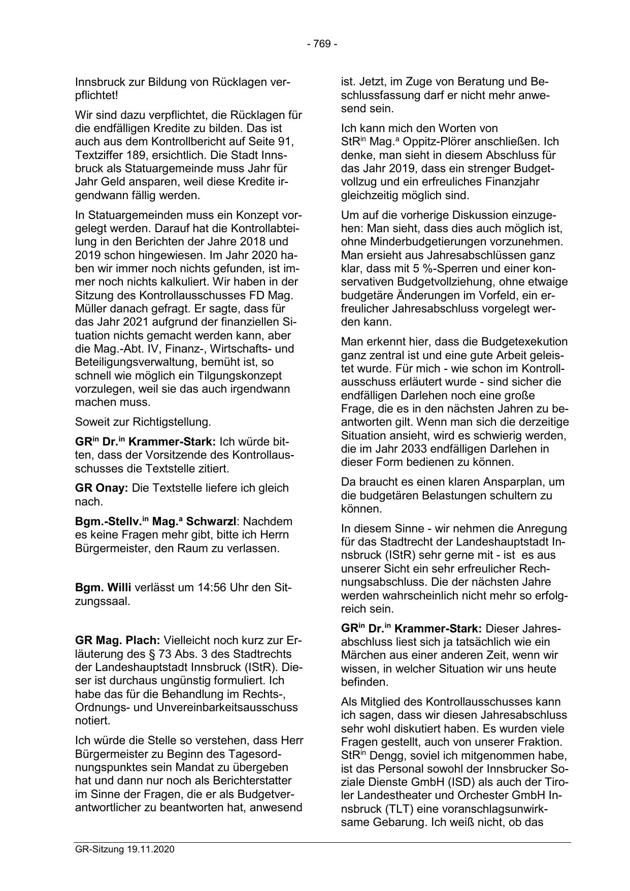 Textziffer 189, ersichtlich. Die Stadt Innsbruck als Statuargemeinde muss Jahr für