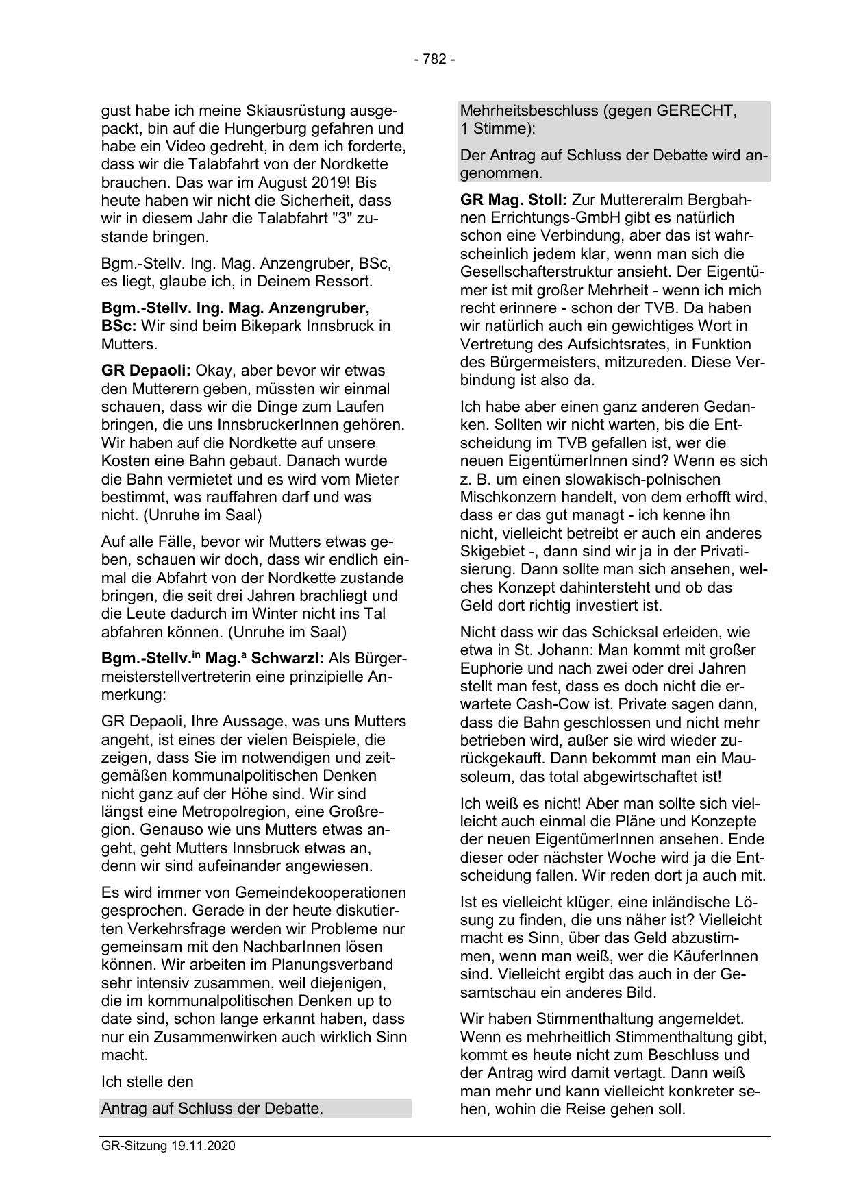 GR Mag. Stoll: Zur Muttereralm Bergbahnen Errichtungs-GmbH gibt es natürlich