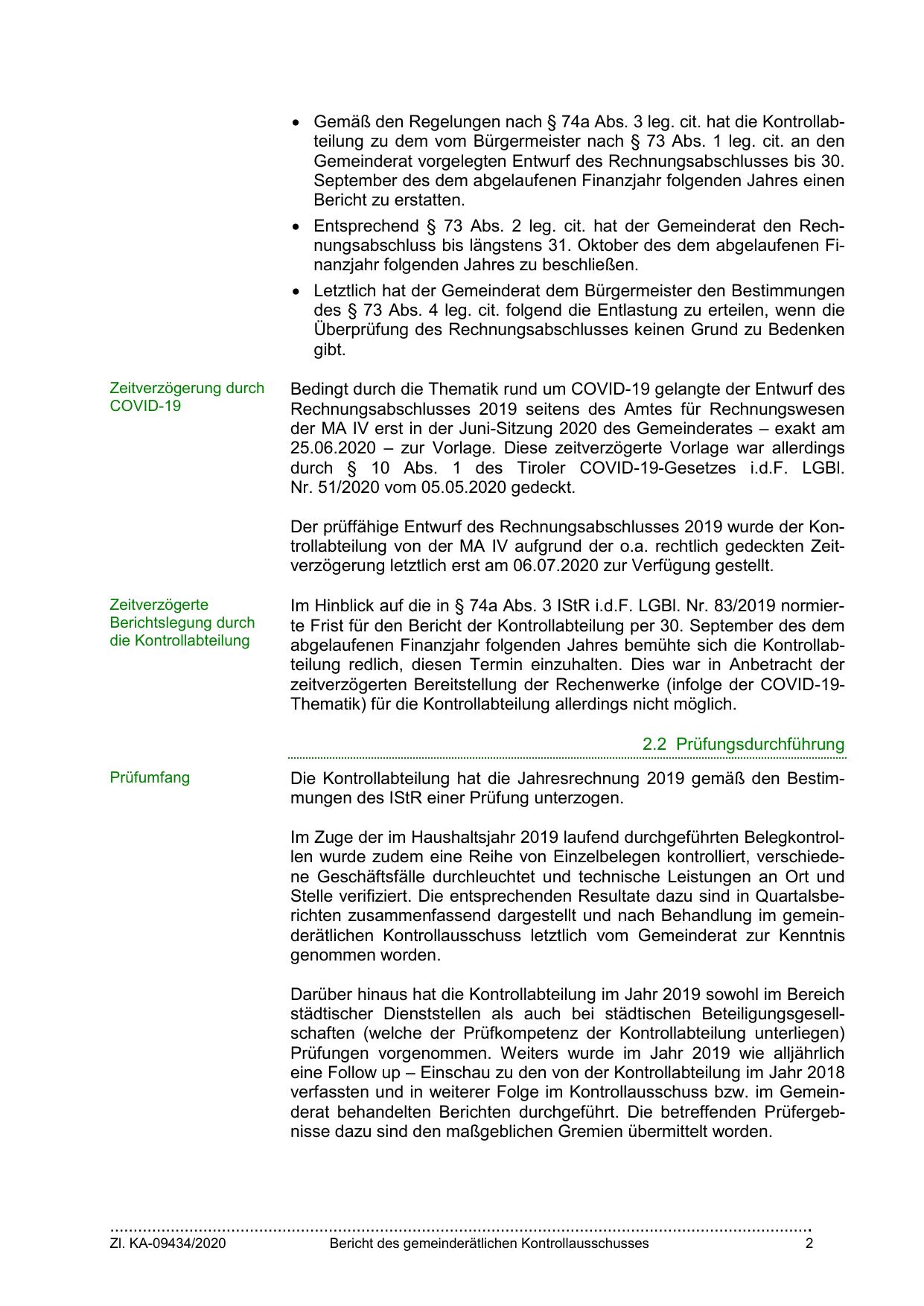 Der prüffähige Entwurf des Rechnungsabschlusses 2019 wurde der Kontrollabteilung von der MA IV aufgrund der o.a. rechtlich gedeckten Zeitverzögerung letztlich erst am 06.07.2020 zur Verfügung gestellt.