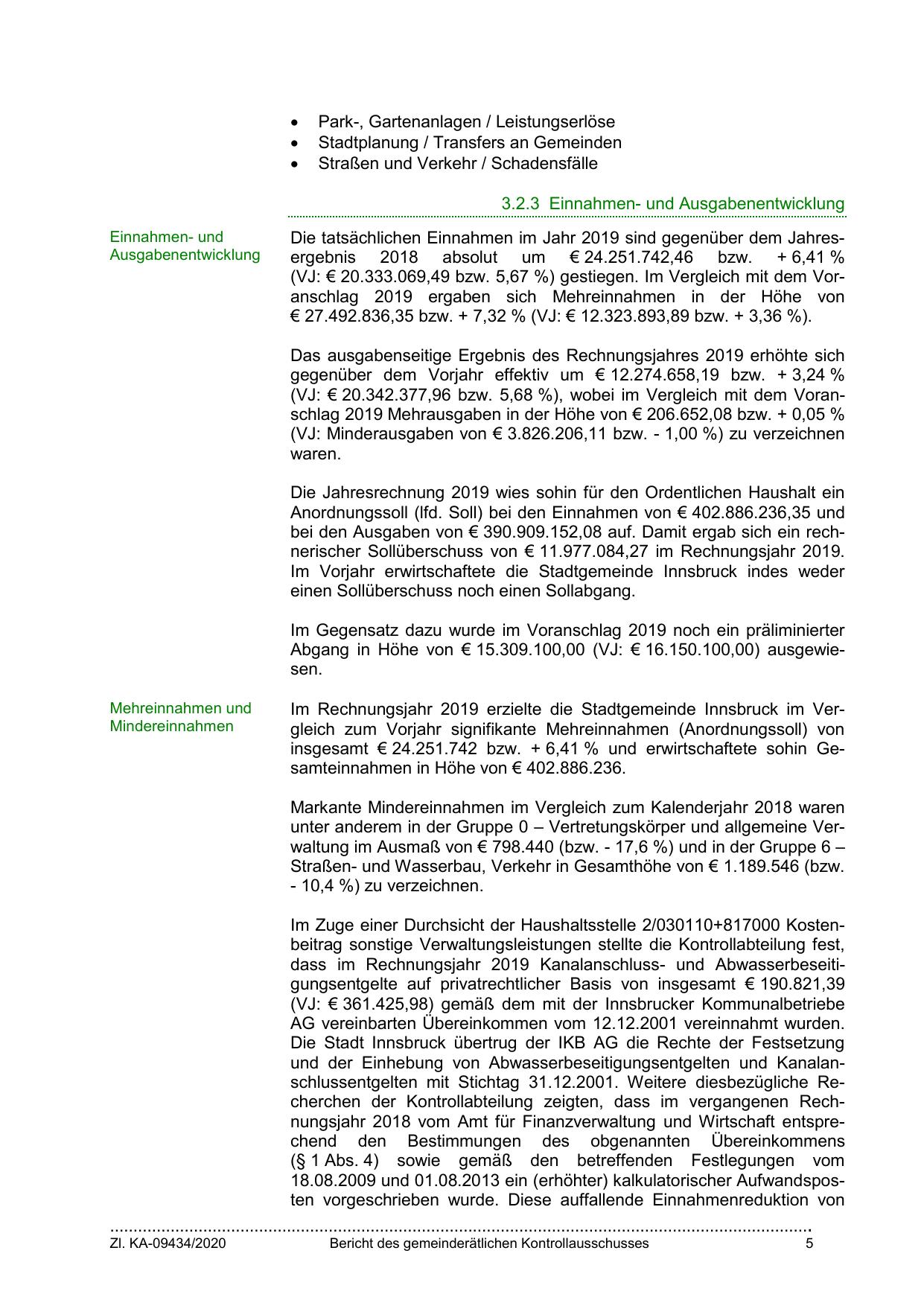 Im Rechnungsjahr 2019 erzielte die Stadtgemeinde Innsbruck im Vergleich zum Vorjahr signifikante Mehreinnahmen (Anordnungssoll) von