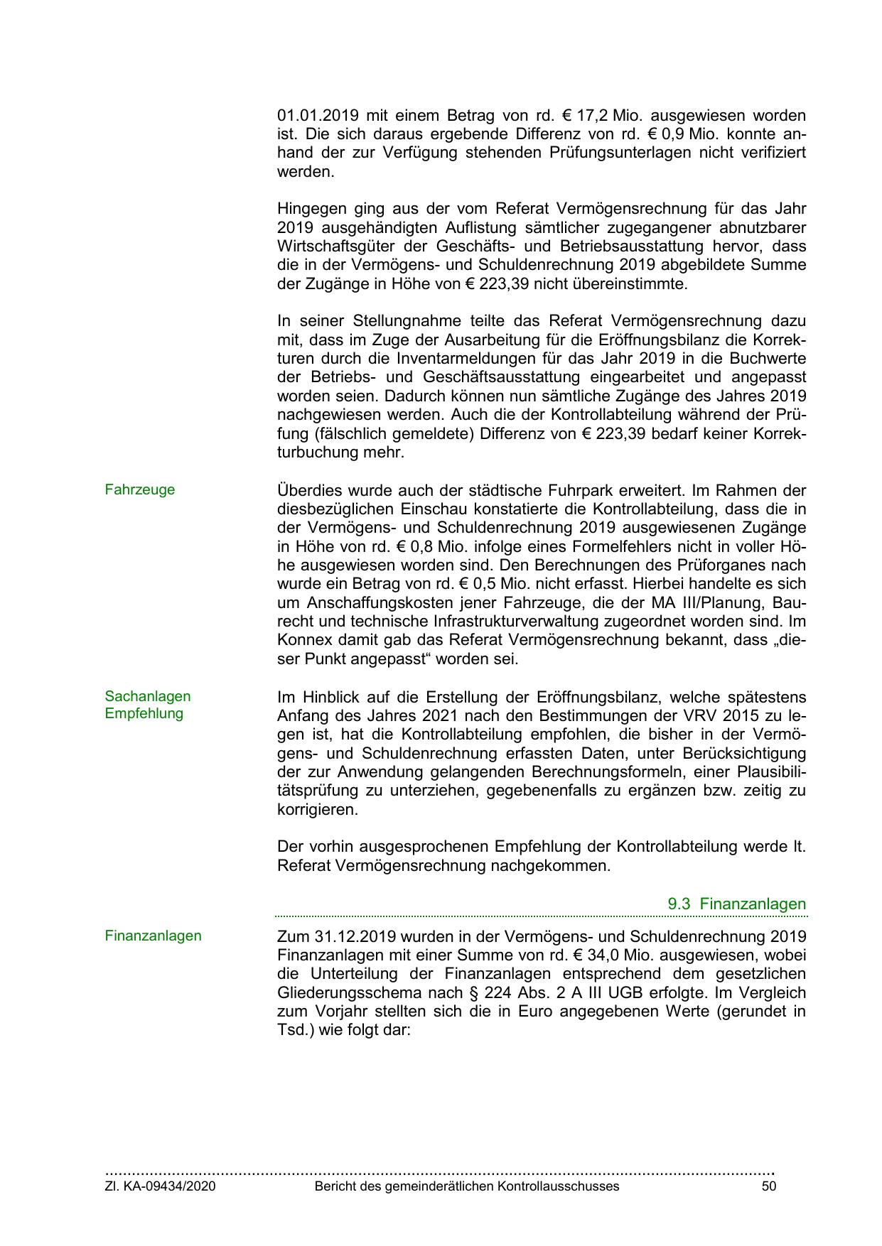 Anfang des Jahres 2021 nach den Bestimmungen der VRV 2015 zu legen ist, hat die Kontrollabteilung empfohlen, die bisher in der Vermögens- und Schuldenrechnung erfassten Daten, unter Berücksichtigung